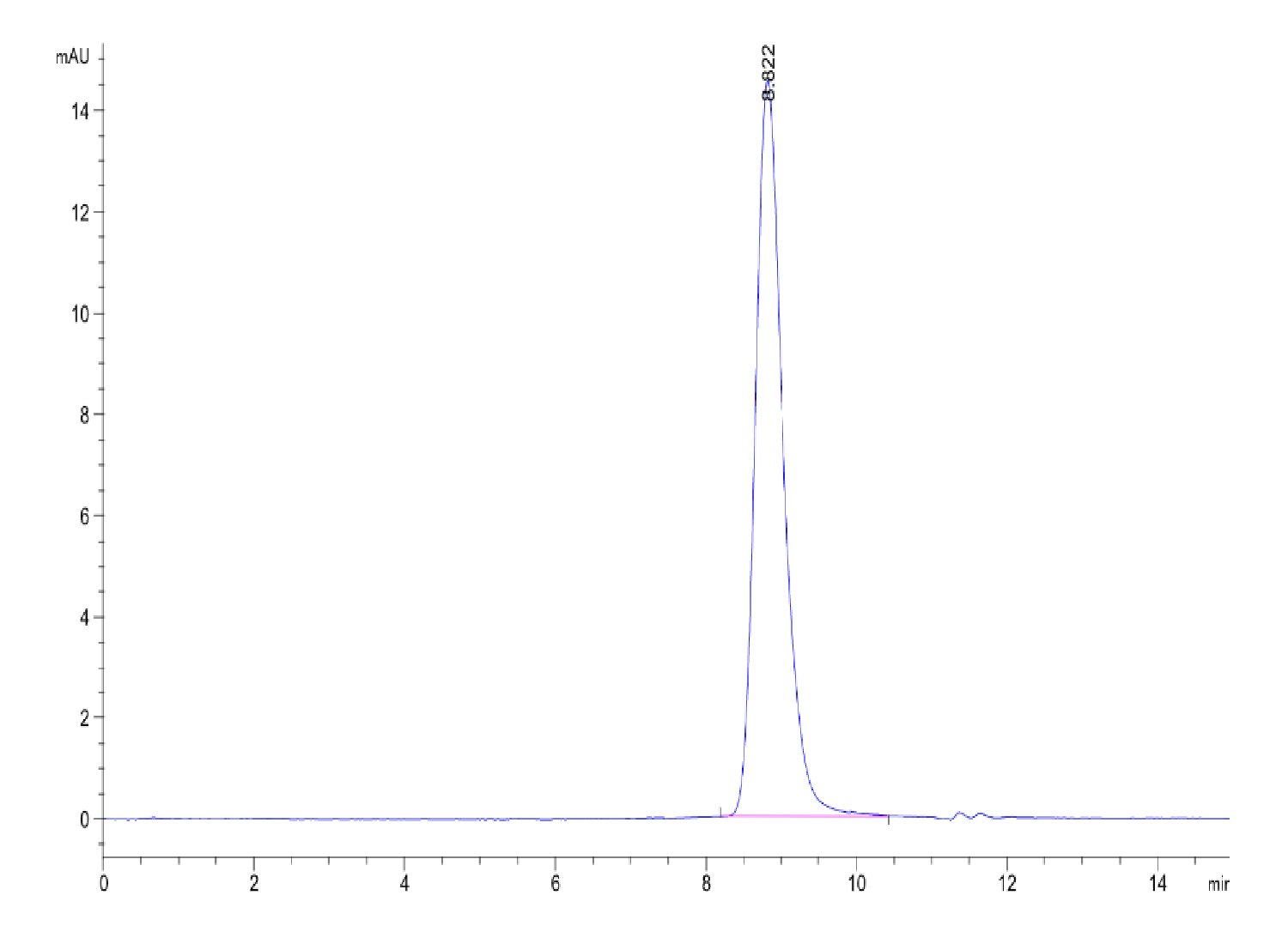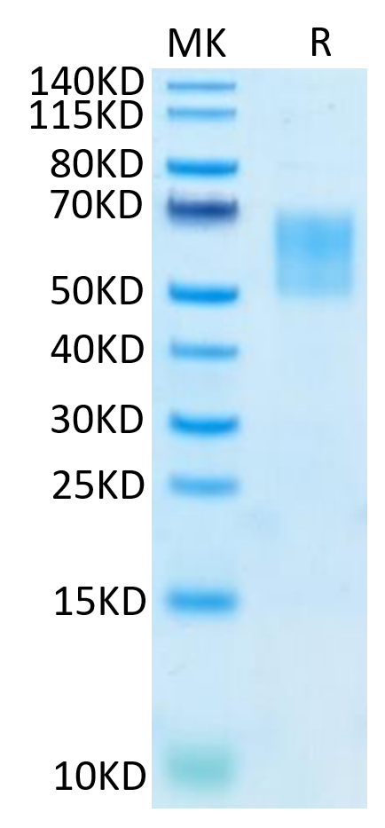 The protein has a predicted MW of 38.2 kDa. Due to glycosylation, the protein migrates to 50-70 kDa based on Bis-Tris PAGE result.