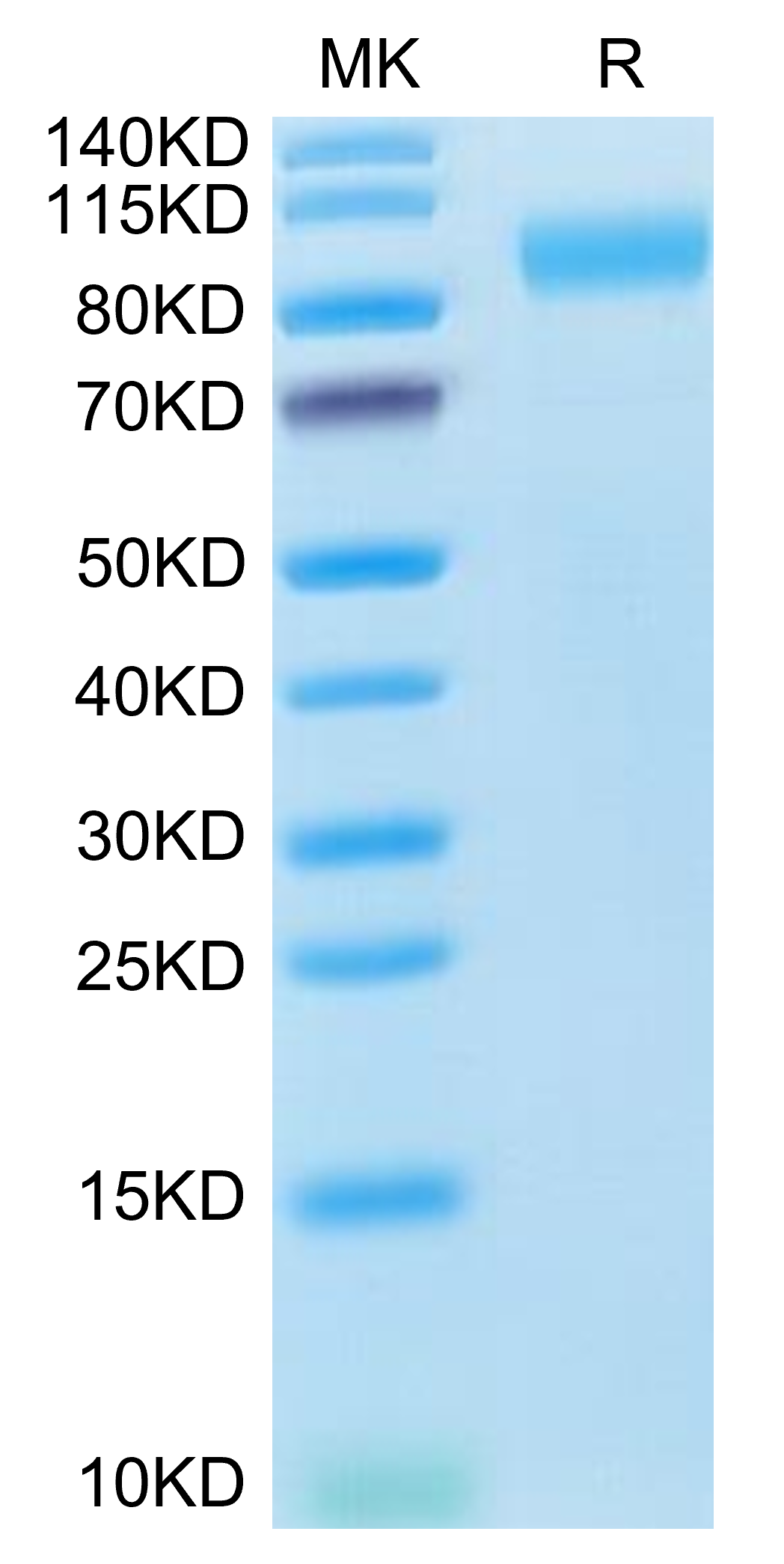 The protein has a predicted MW of 84.7 kDa. Due to glycosylation, the protein migrates to 85-110 kDa based on Bis-Tris PAGE result.