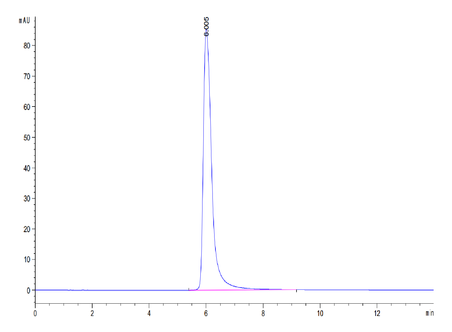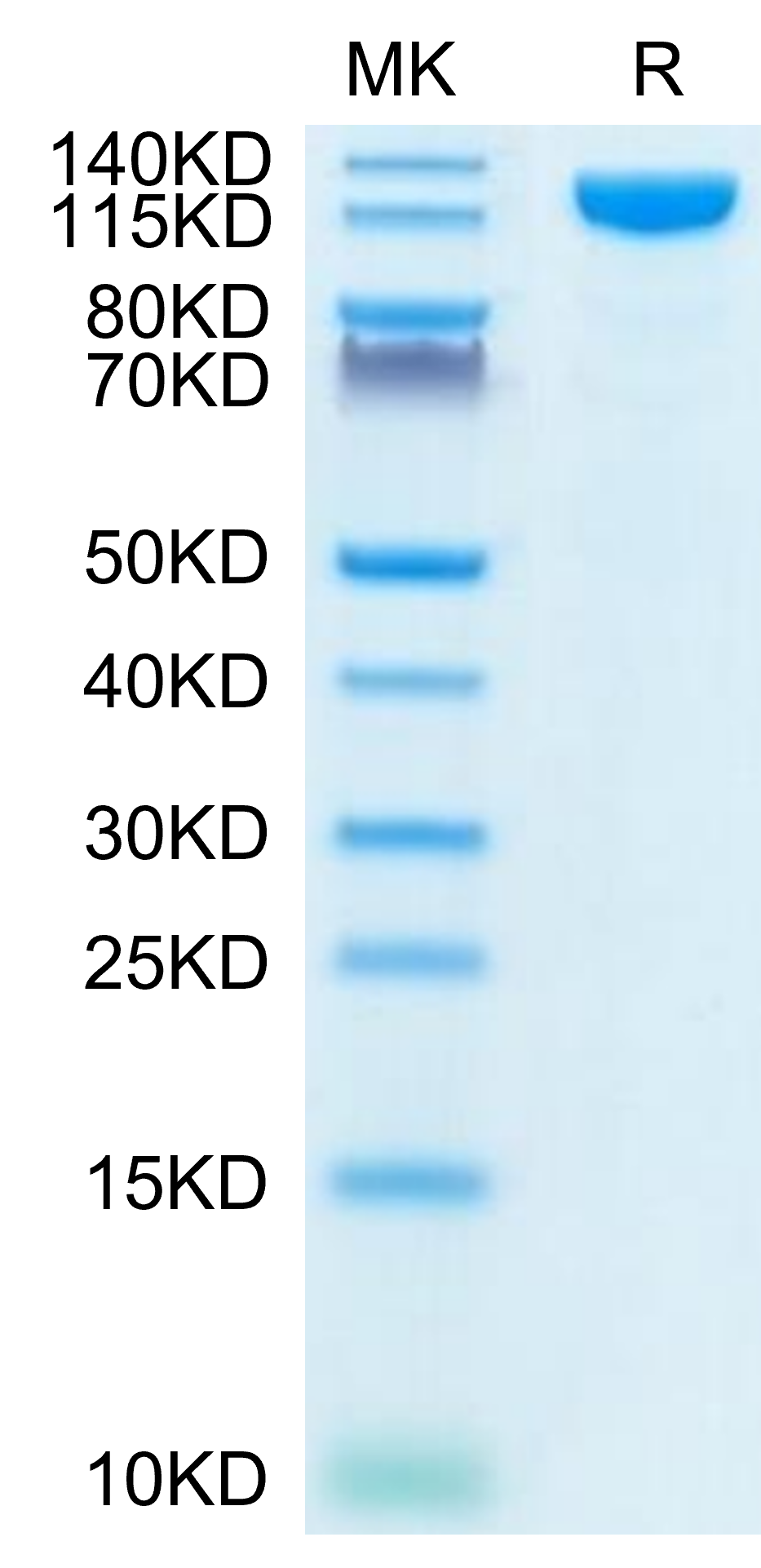 The protein has a predicted MW of 109.2 kDa. Due to glycosylation, the protein migrates to 115-130 kDa based on Bis-Tris PAGE result.