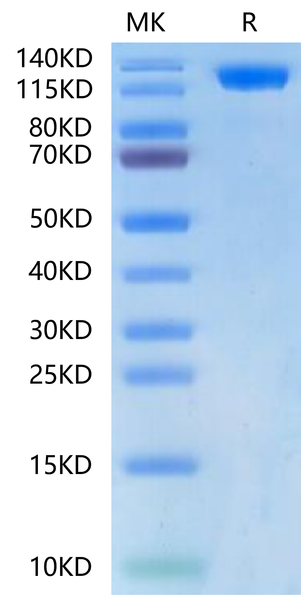 The protein has a predicted MW of 111.2 kDa. Due to glycosylation, the protein migrates to 115-125 kDa based on Bis-Tris PAGE result.