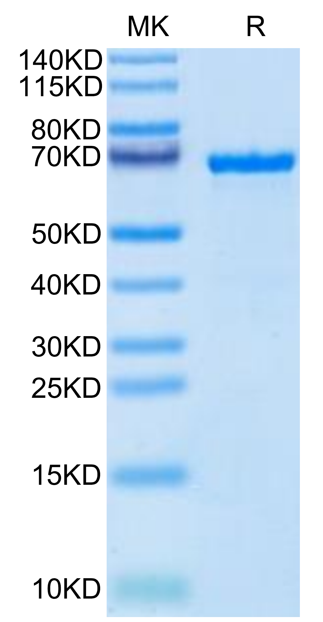 The protein has a predicted MW of 67.53 kDa. Due to glycosylation, the protein migrates to 68-75 kDa based on Bis-Tris PAGE result.