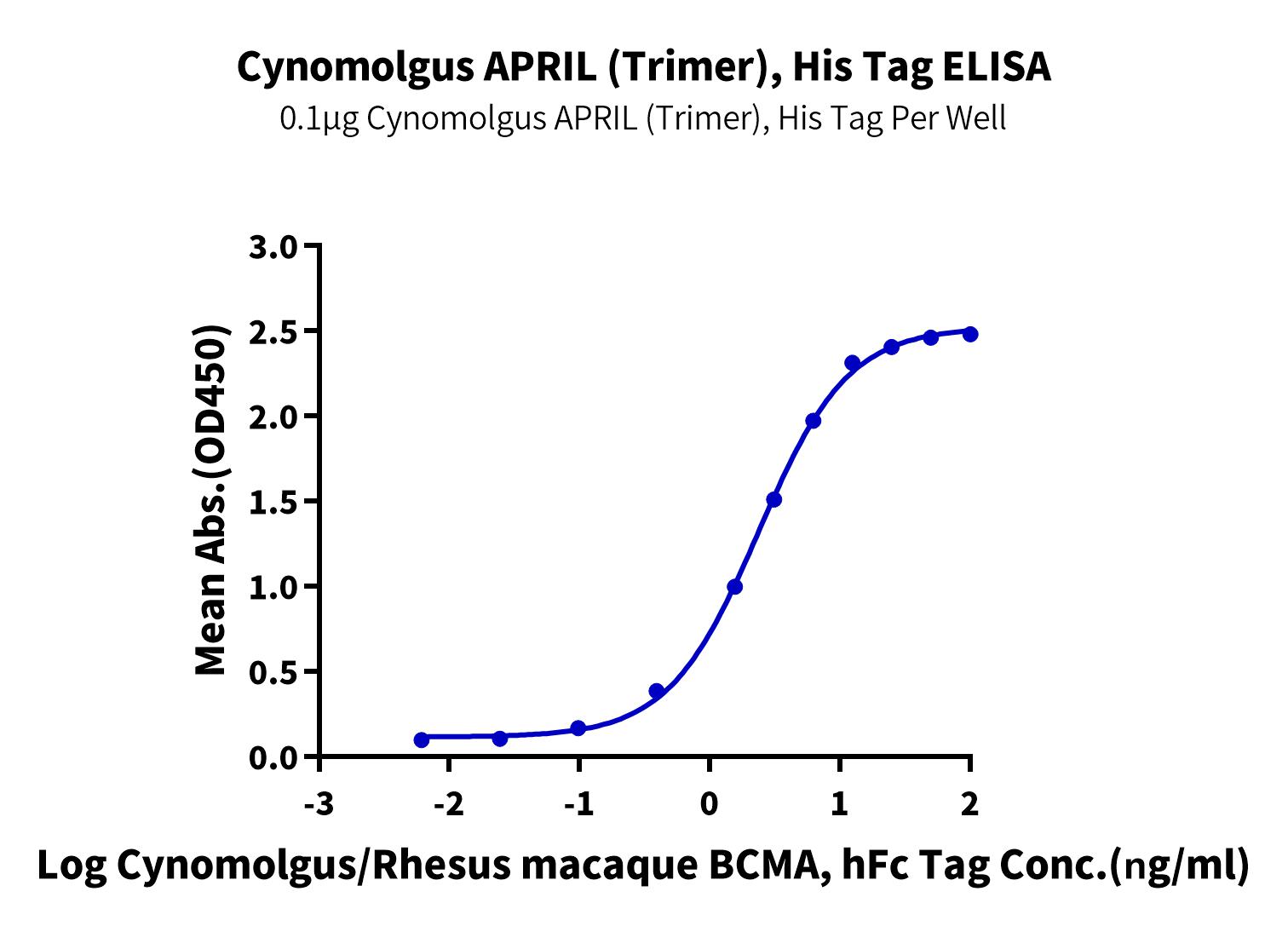 Recombinant Cynomolgus APRIL/TNFSF13 Trimer Protein is expressed from HEK293 with His tag and Flag tag and Avi tag at the N-Terminus.It contains Lys112-Leu250 trimer design [Accession | A0A2K5TJA1].