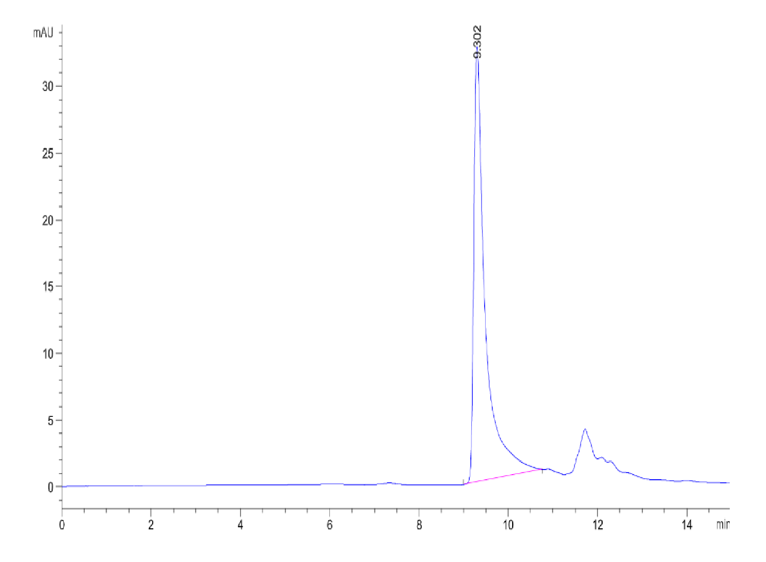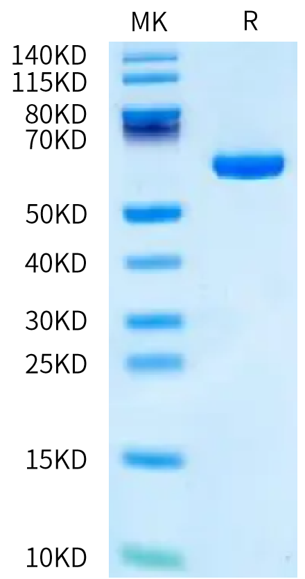 The protein has a predicted MW of 52.1 kDa. Due to glycosylation, the protein migrates to 55-65 kDa based on Bis-Tris PAGE result.