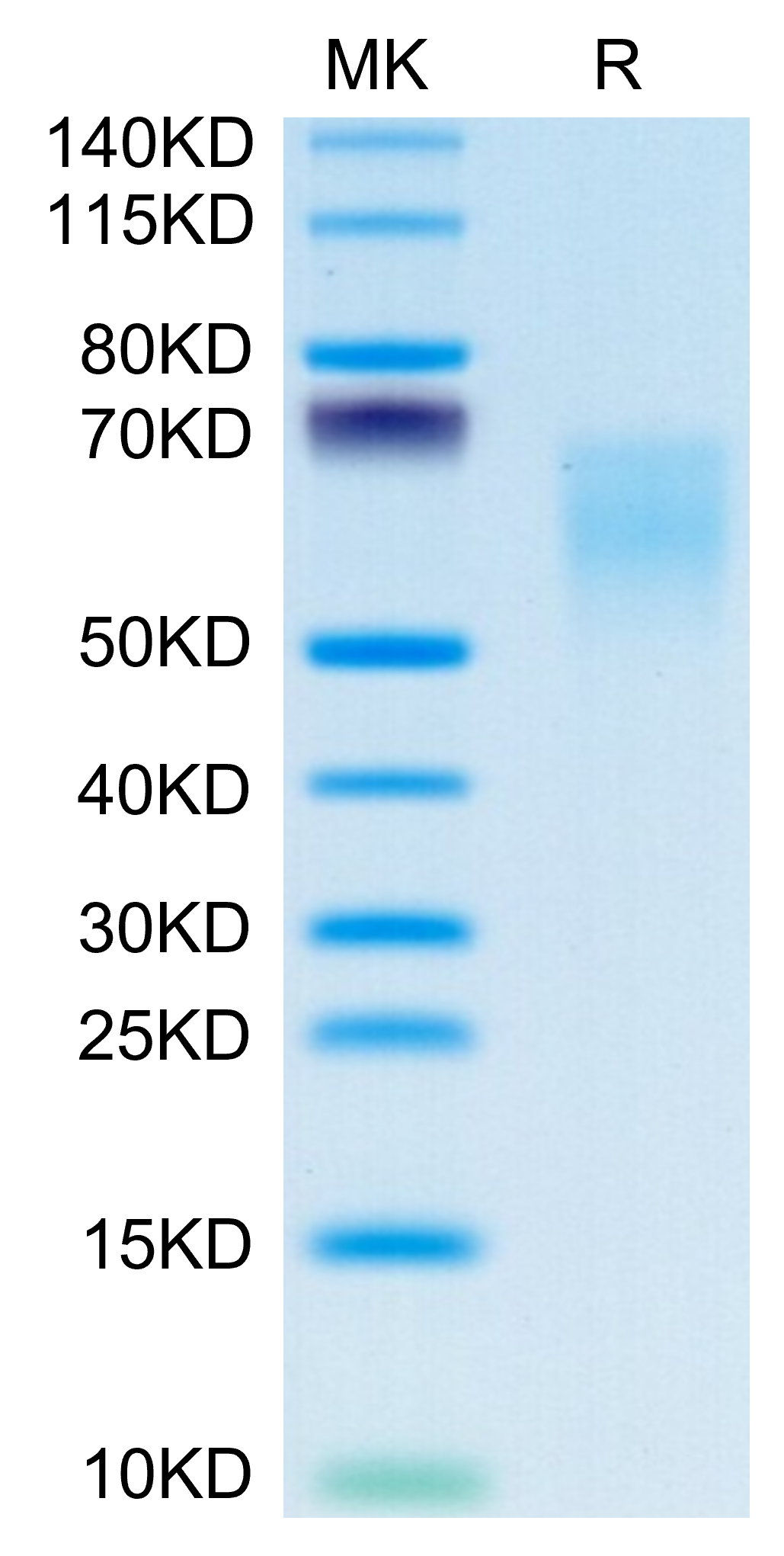 The protein has a predicted MW of 28.2 kDa. Due to glycosylation, the protein migrates to 55-70 kDa based on Bis-Tris PAGE result.