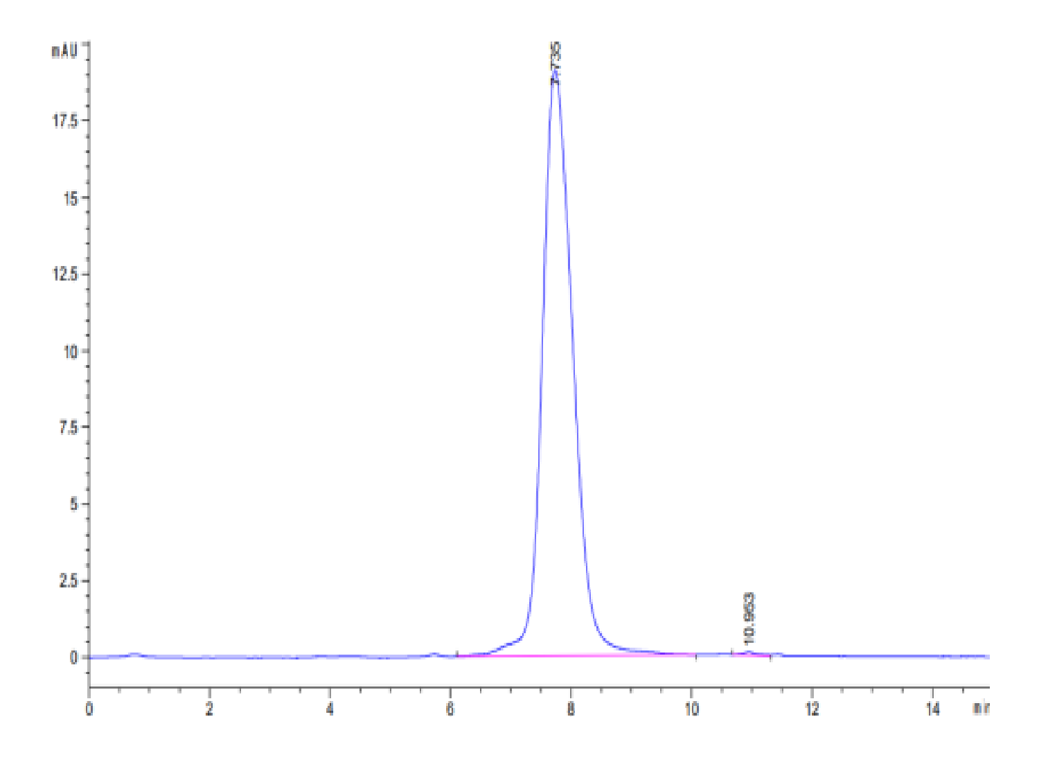 The protein has a predicted MW of 75.76 kDa. Due to glycosylation, the protein migrates to 100-120 kDa based on Bis-Tris PAGE result.