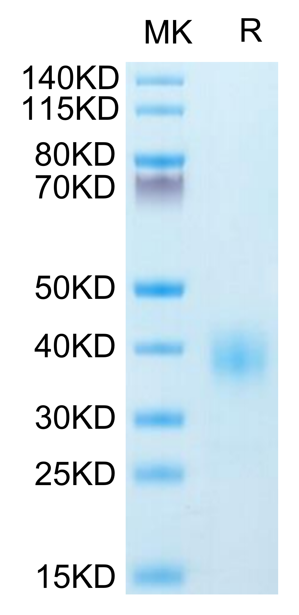 The protein has a predicted MW of 16.7 kDa. Due to glycosylation, the protein migrates to 35-45 kDa based on Bis-Tris PAGE result.