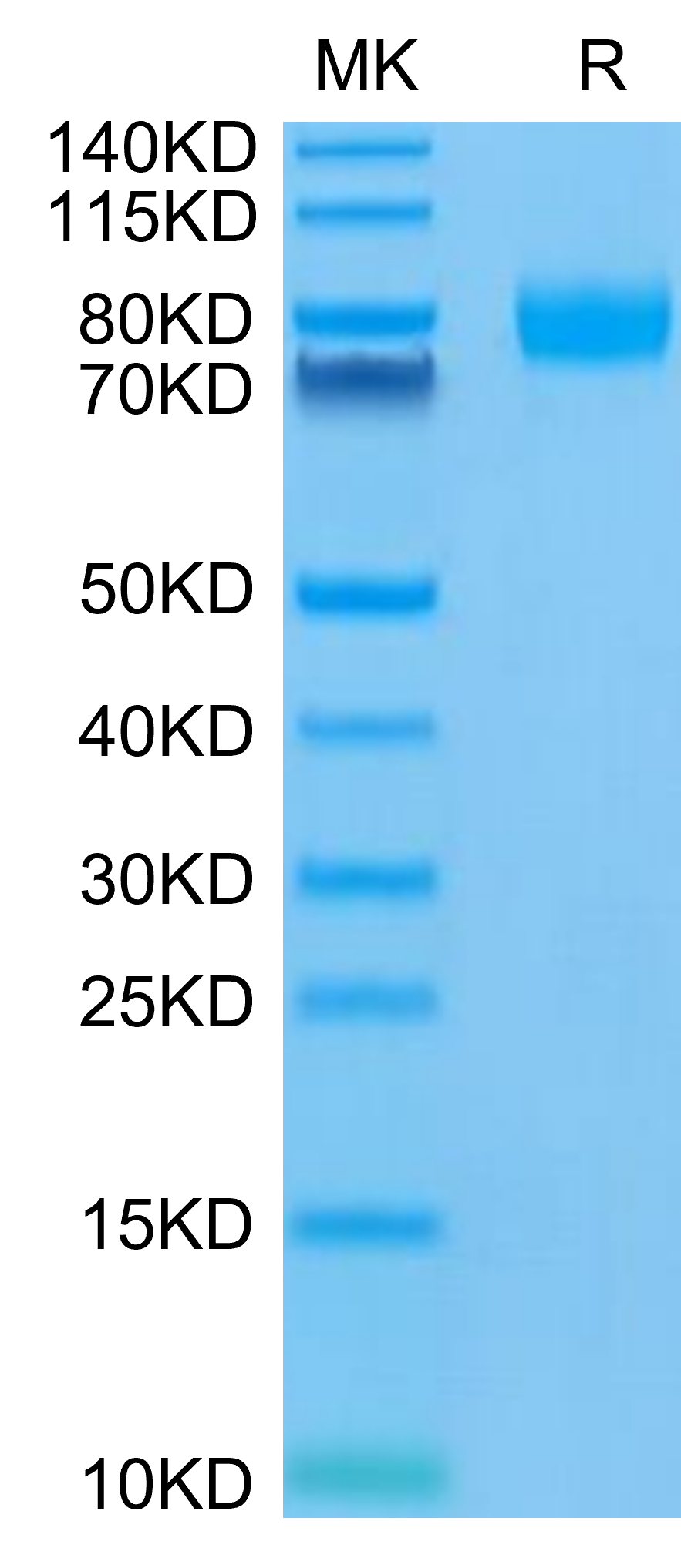 The protein has a predicted MW of 61.8 kDa. Due to glycosylation, the protein migrates to 75-100 kDa based on Bis-Tris PAGE result.