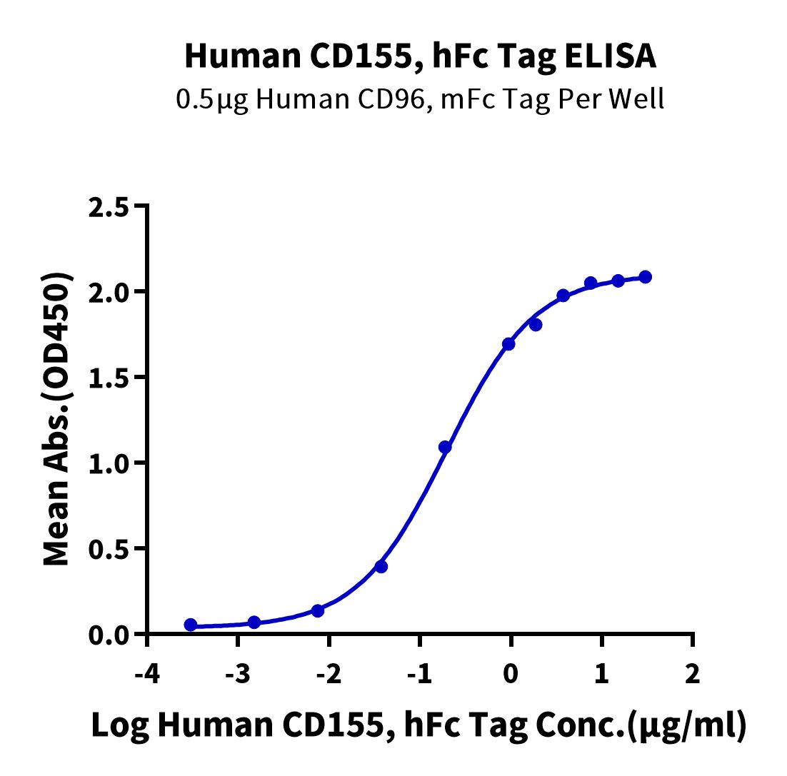 Recombinant Human CD155/PVR Protein is expressed from HEK293 with hFc tag at the C-Terminus.It contains Trp21-Asn343 [Accession | P15151-1].