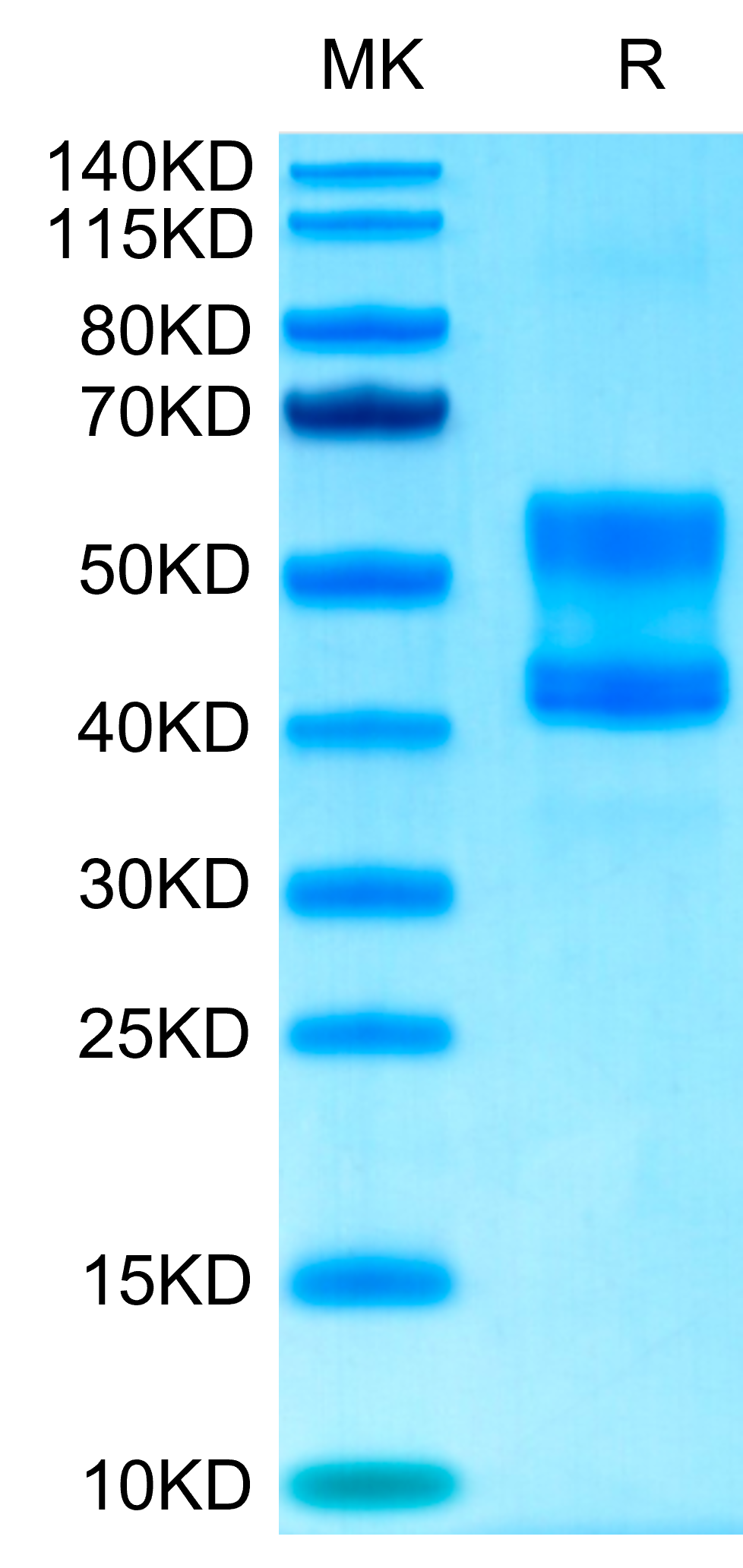 The protein has a predicted MW of 36.9 kDa (CD3E) and 35.4 kDa (CD3D). Due to glycosylation,the protein migrates to 58-62 kDa (CD3E) and 44-46 kDa (CD3D) based on Bis-Tris PAGE result. |