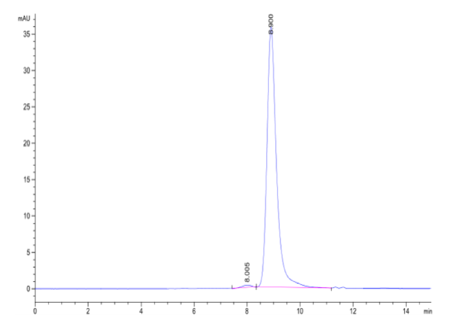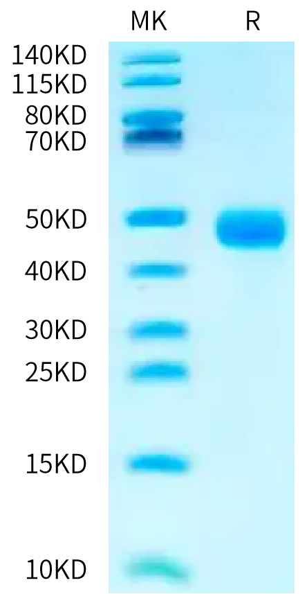 The protein has a predicted MW of 33.89 kDa. Due to glycosylation, the protein migrates to 42-52 kDa based on Bis-Tris PAGE result.
