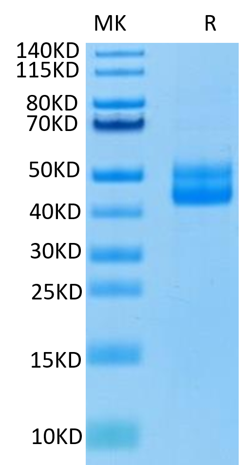 The protein has a predicted MW of 36.1 kDa. Due to glycosylation, the protein migrates to 35-55 kDa based on Bis-Tris PAGE result.