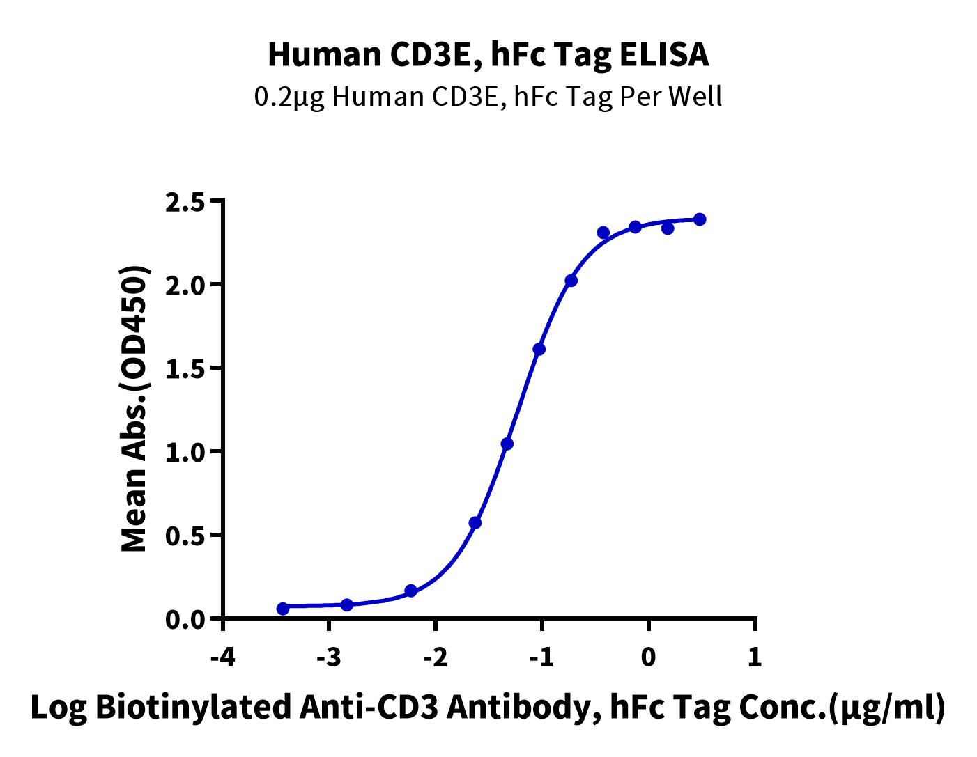 Recombinant Human CD3E/CD3 epsilon Protein is expressed from HEK293 with hFc (IgG1) tag at the C-Terminus.It contains Asp23-Asp126 (C119S, C122S) [Accession | P07766].