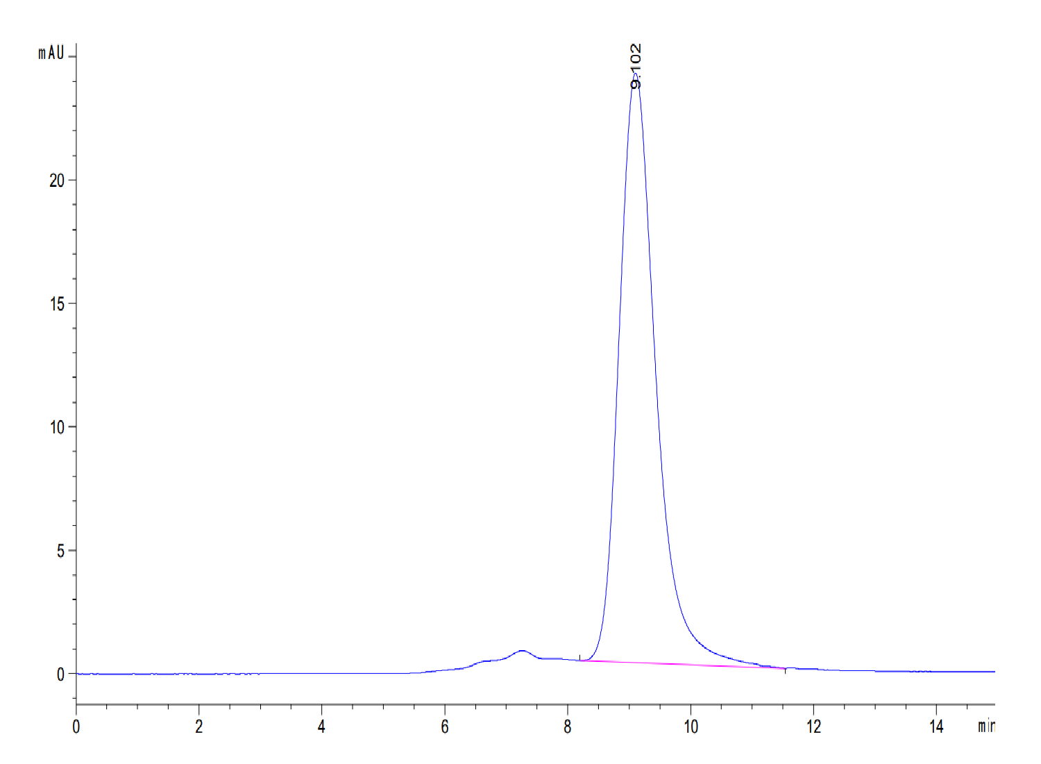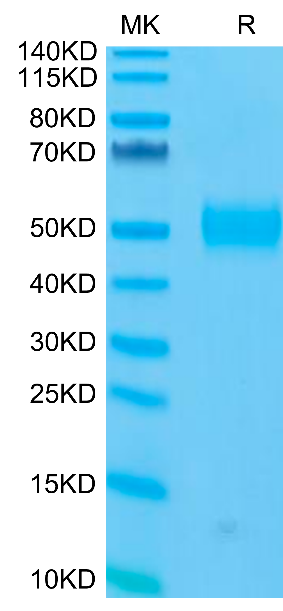 The protein has a predicted MW of 29.6 kDa. Due to glycosylation, the protein migrates to 52-60 kDa based on Bis-Tris PAGE result.