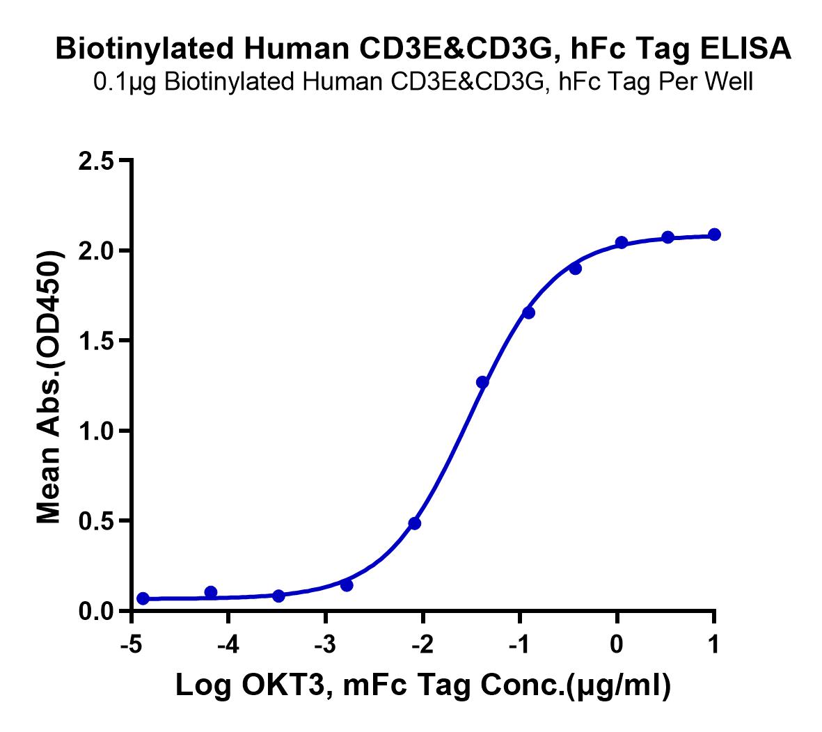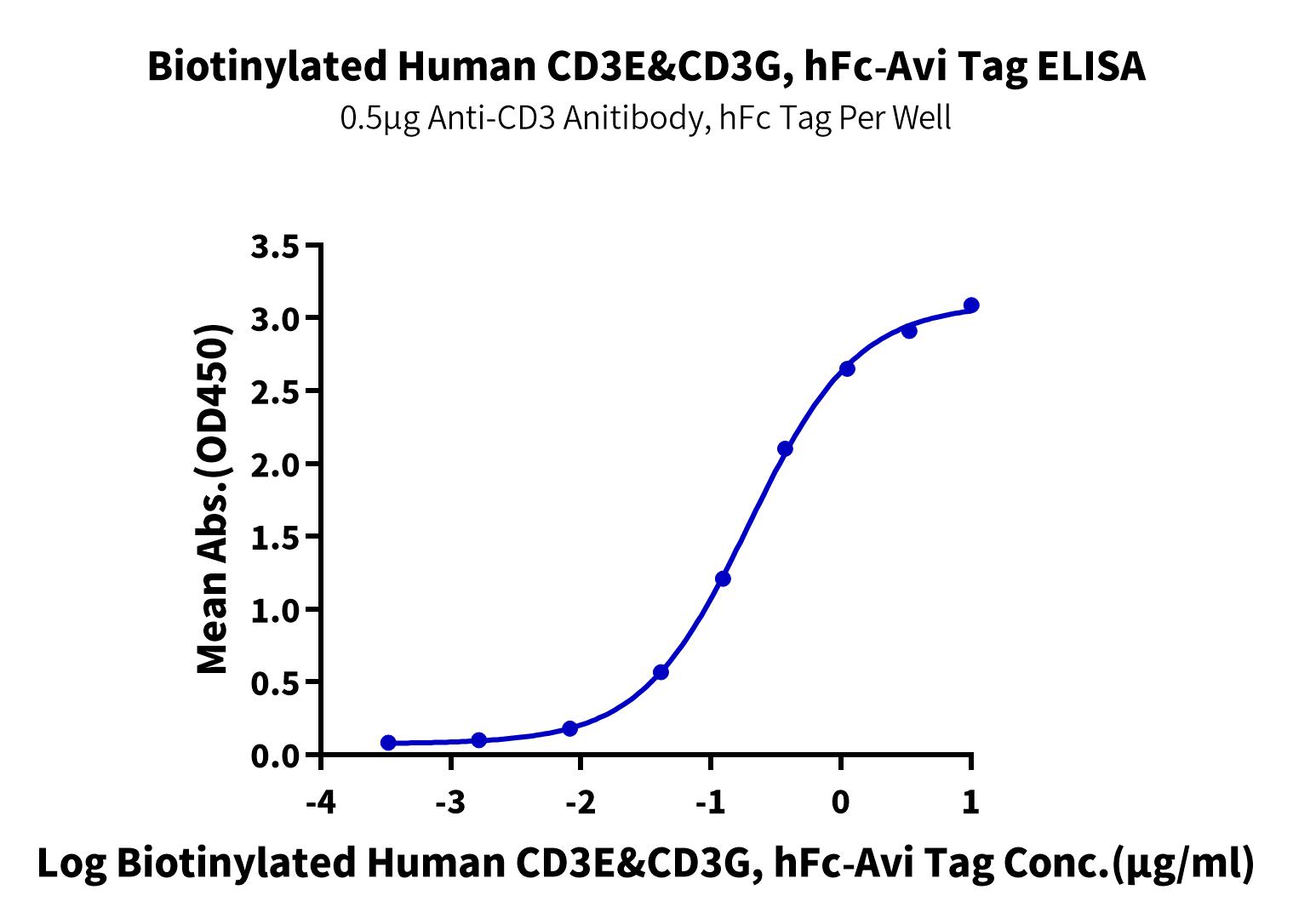 Recombinant Biotinylated Human CD3E&CD3G/CD3 epsilon&CD3 gamma Protein is expressed from HEK293 with hFc (IgG1) tag and Avi tag at the C-Terminus of CD3E and hFc (IgG1) tag at the C-Terminus of CD3G.It contains Asp23-Asp126(CD3E) and Gln23-Ser116(CD3G) [Accession | P07766(CD3E)&P09693(CD3G)].