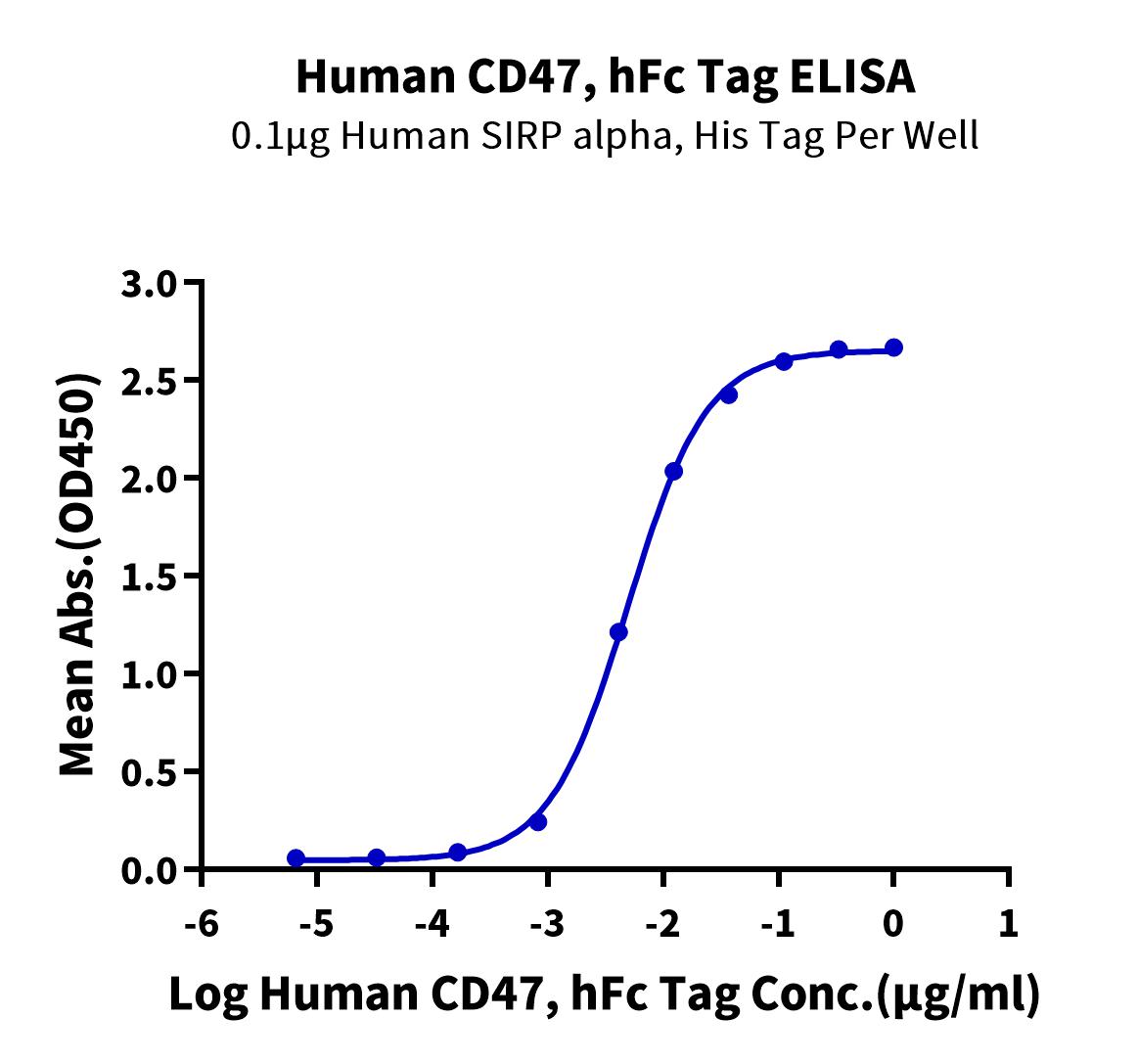 Recombinant Human CD47 Protein is expressed from HEK293 with hFc (IgG1) tag at the C-Terminus.It contains Gln19-Pro139 [Accession | Q08722-1]. |