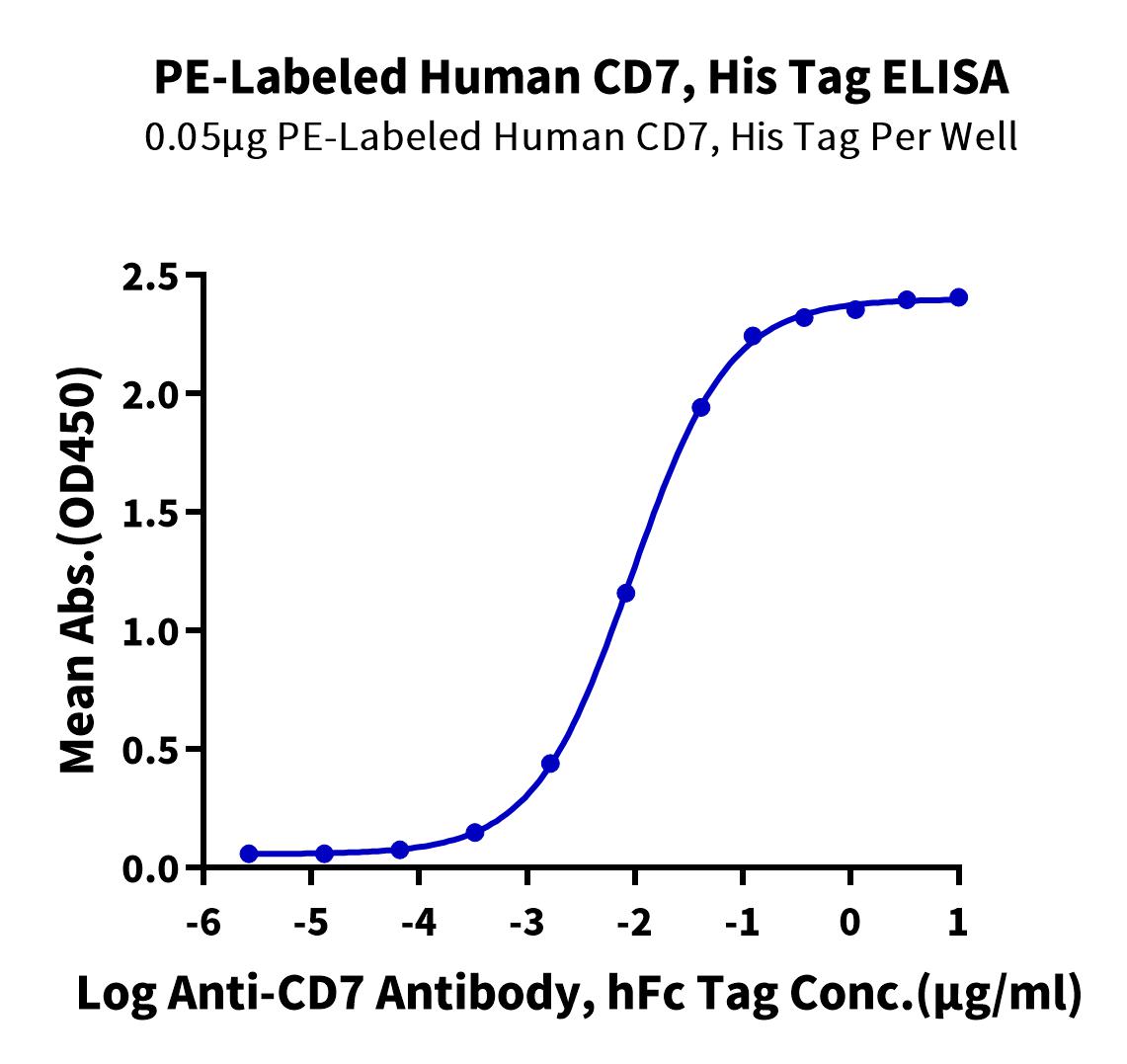 Recombinant PE-Labeled Human CD7 Protein is expressed from HEK293 His tag and Avi tag at the C-Terminus.It contains Ala26-Pro180 [Accession | P09564].
