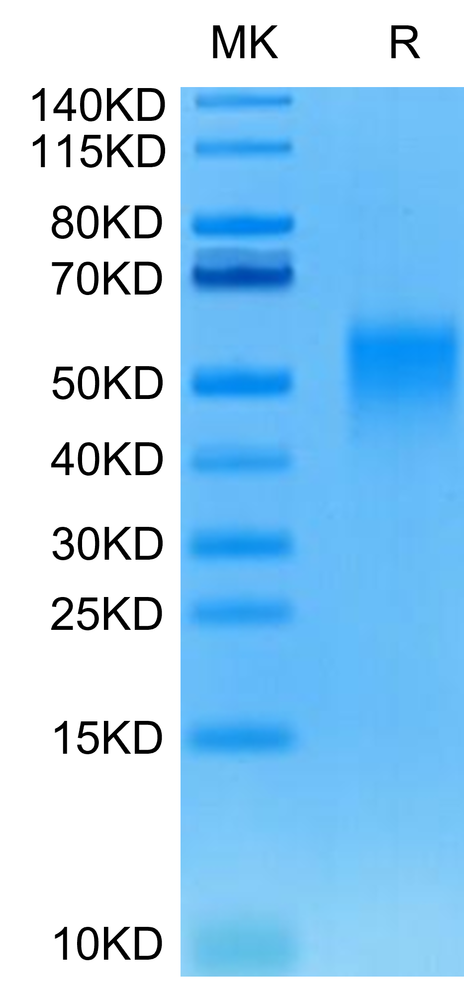 The protein has a predicted MW of 18.2 kDa. Due to glycosylation, the protein migrates to 36-52 kDa based on Bis-Tris PAGE result.