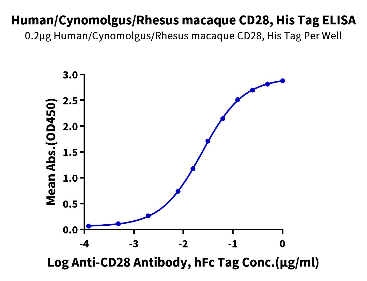Recombinant Human/Cynomolgus/Rhesus macaque CD28 Protein is expressed from HEK293 with His tag and Avi tag at the N-Terminus.It contains Asn19-Pro152 [Accession | P10747-1].