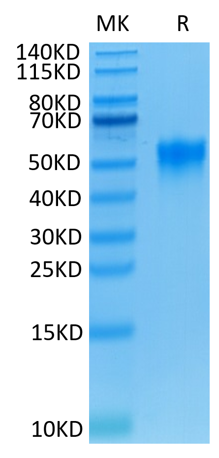 The protein has a predicted MW of 24.7 kDa. Due to glycosylation, the protein migrates to 48-58 kDa based on Bis-Tris PAGE result.