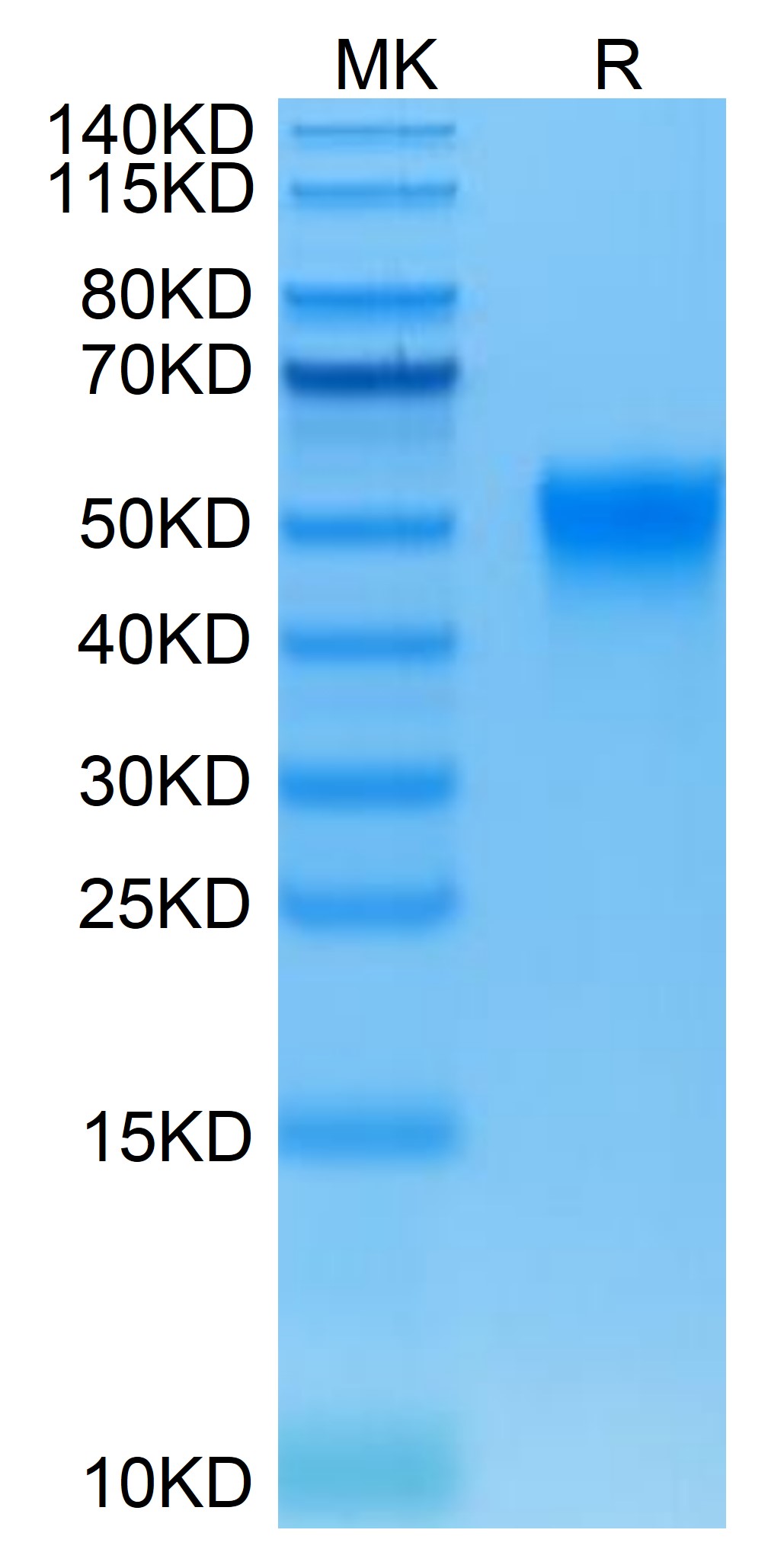 The protein has a predicted MW of 24.7 kDa. Due to glycosylation, the protein migrates to 48-58 kDa based on Bis-Tris PAGE result.
