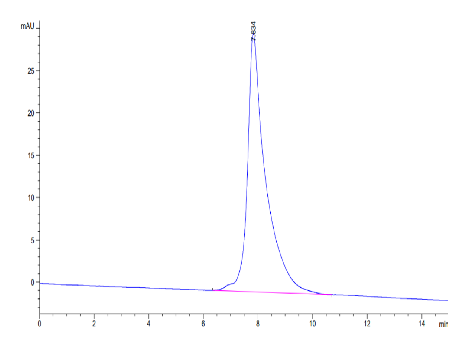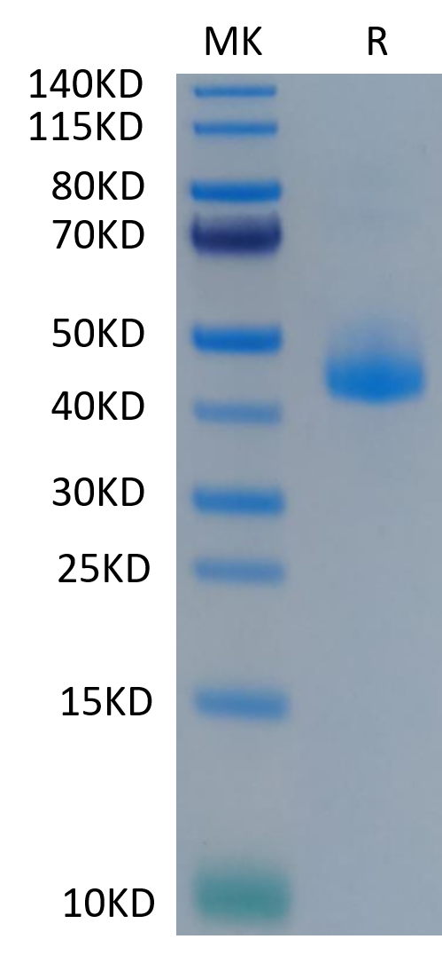 The protein has a predicted MW of 36.9 kDa. Due to glycosylation, the protein migrates to 43-48 kDa based on Bis-Tris PAGE result.