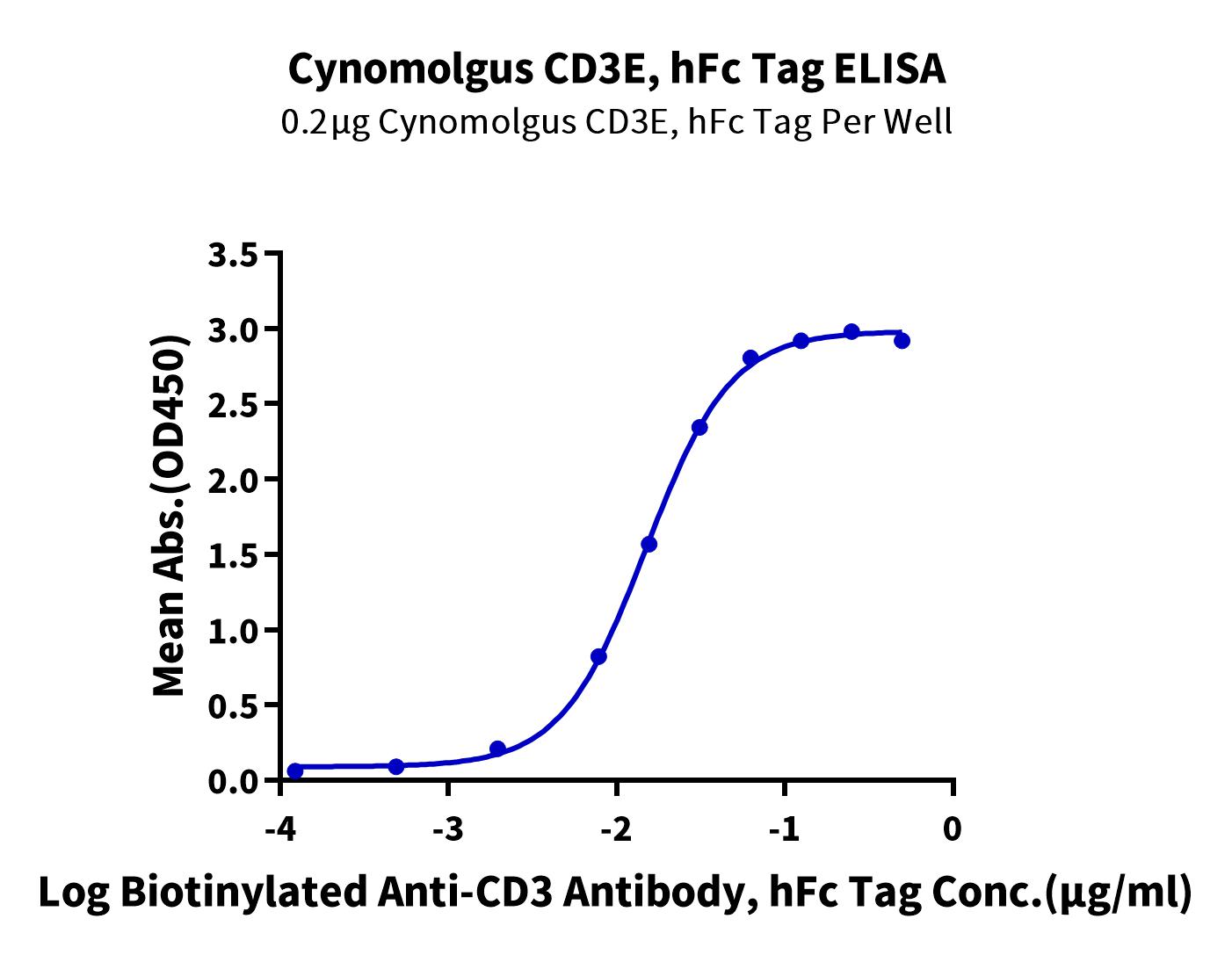 Recombinant Cynomolgus CD3E/CD3 epsilon Protein is expressed from HEK293 with hFc (IgG1) tag at the C-Terminus.It contains Gln22-Asp117 [Accession | Q95LI5-1].