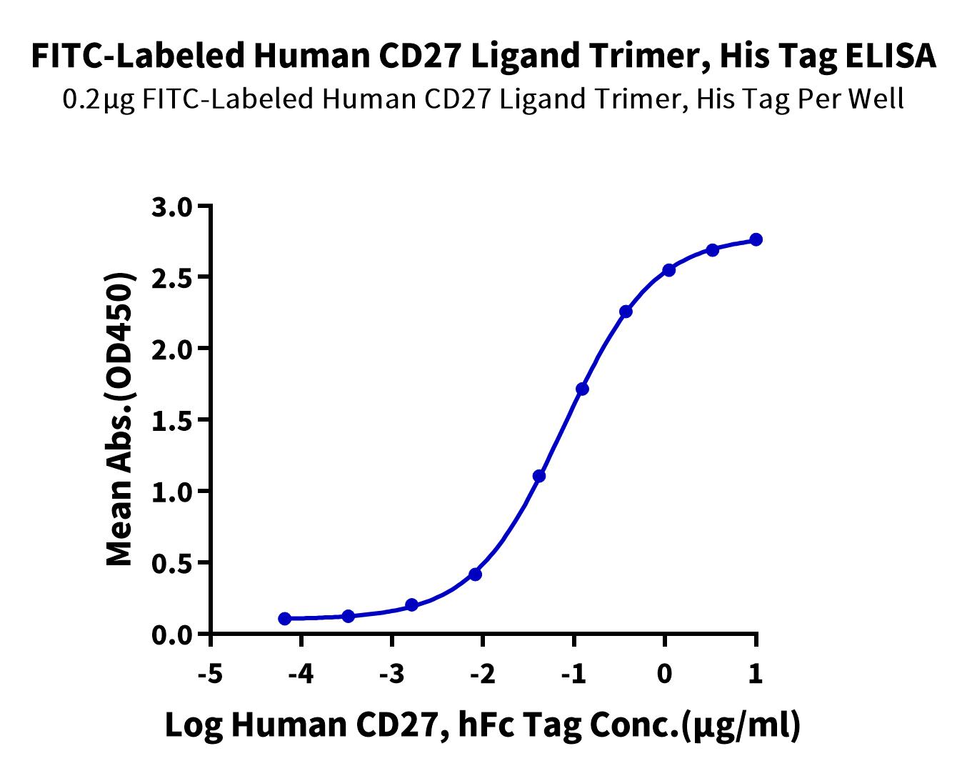 Immobilized FITC-Labeled Human CD27 Ligand Trimer, His Tag at 2μg/ml (100μl/well) on the plate. Dose response curve for Human CD27, hFc Tag with the EC50 of 22.7ng/ml determined by ELISA. (QC Test)