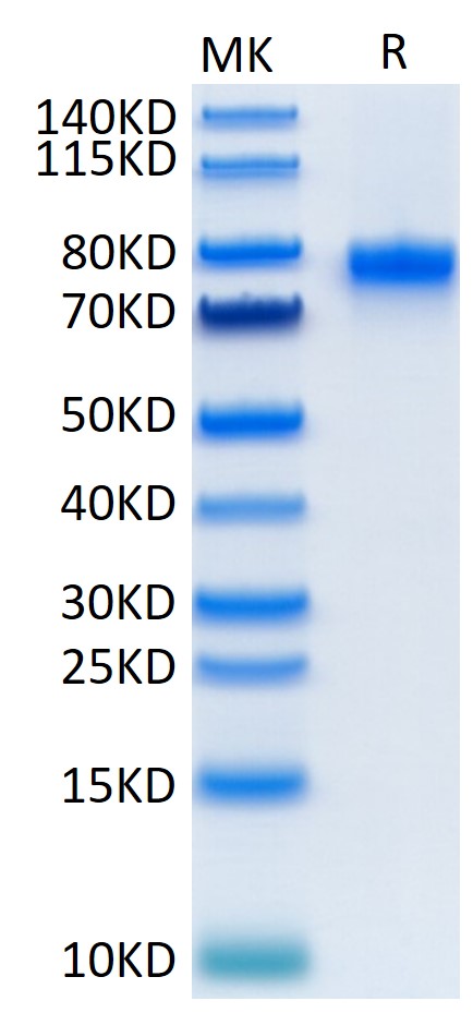 The protein has a predicted MW of 75.6 kDa. Due to glycosylation, the protein migrates to 76-80 kDa based on Bis-Tris PAGE result.
