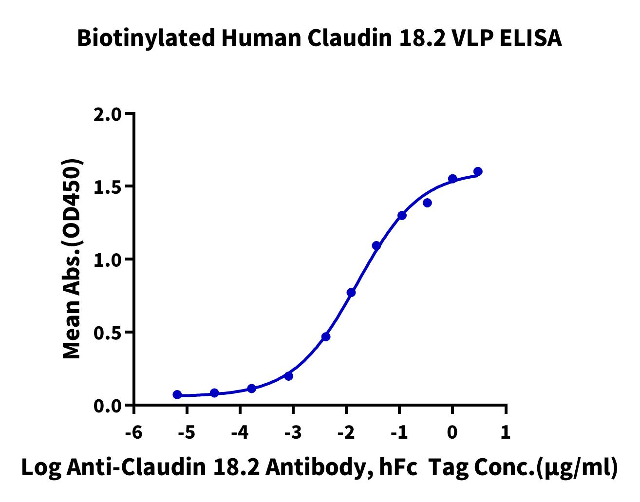 Recombinant Biotinylated Human Claudin 18.2 VLP is expressed from HEK293.It contains Met1-Val261 (It may have cross reaction with anti-His antibody) [Accession | P56856-2].