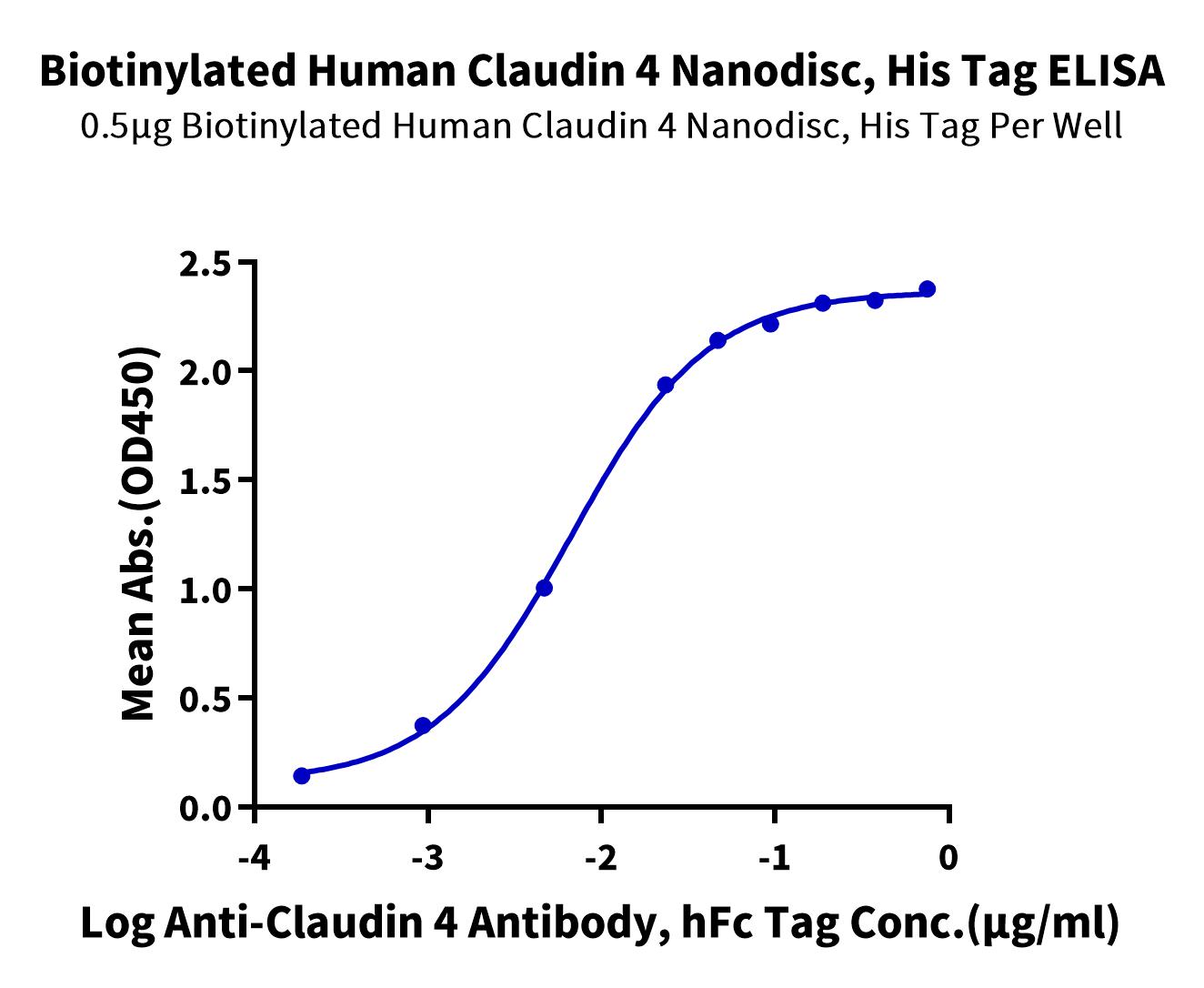 Recombinant Biotinylated Human Claudin 4 Nanodisc is expressed from HEK293 with His tag at the C-terminus.It contains Met1-Val209 [Accession | O14493].