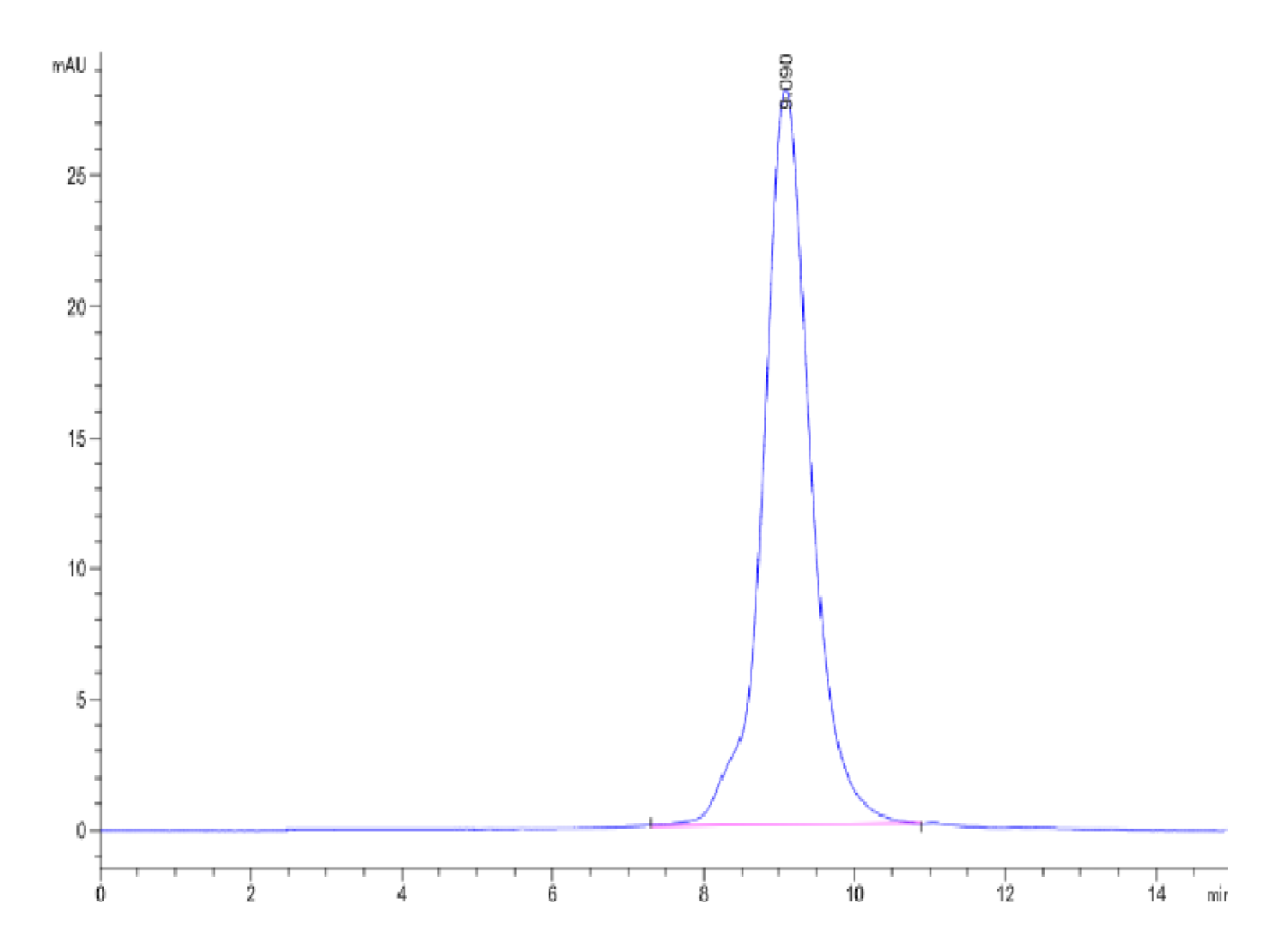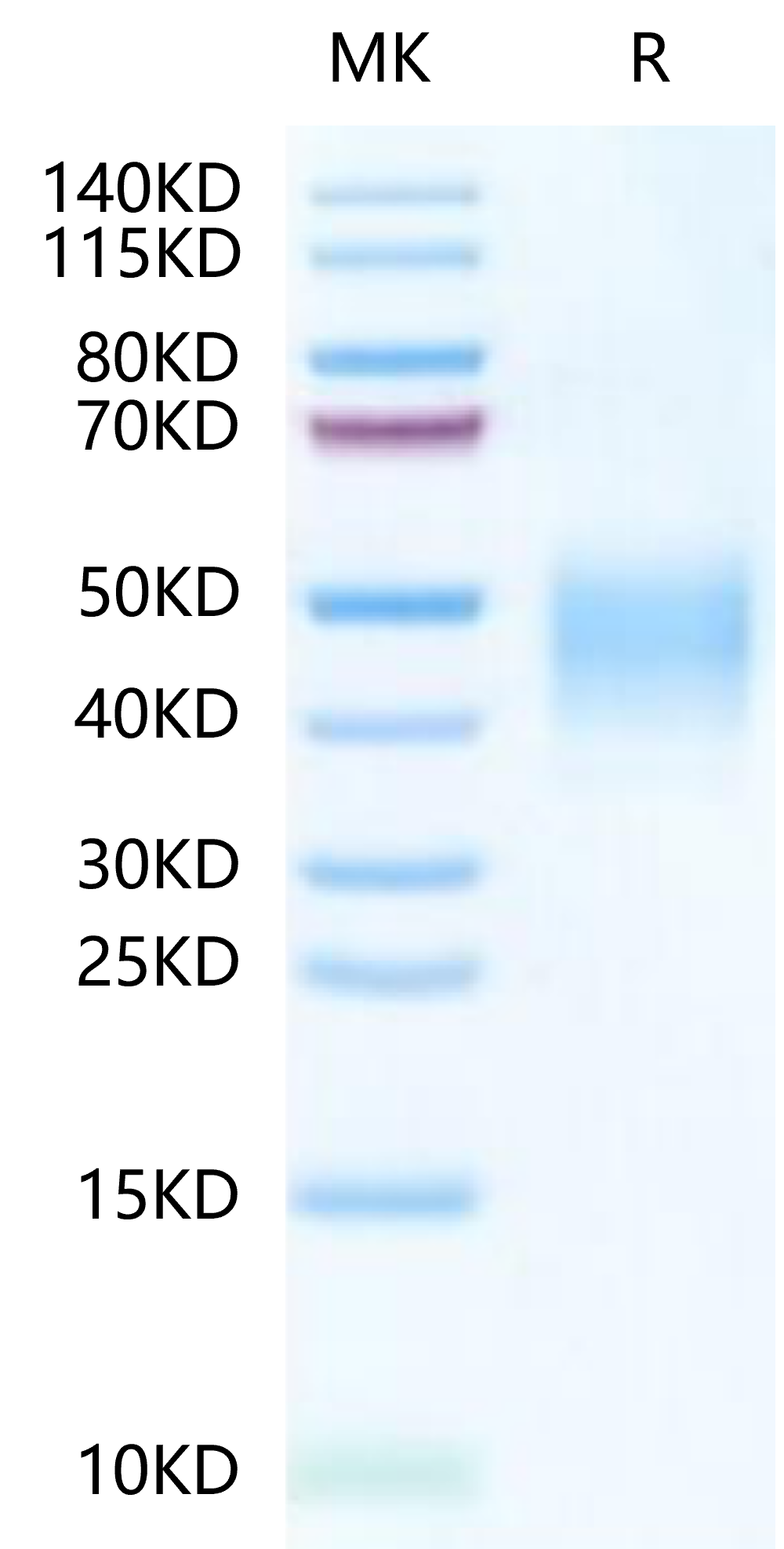 The protein has a predicted MW of 24.6 kDa. Due to glycosylation, the protein migrates to 35-55 kDa based on Bis-Tris PAGE result.