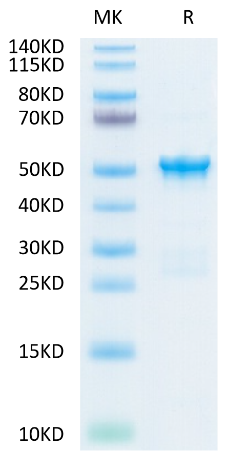 The protein has a predicted MW of 48.9 kDa. The protein migrates to 47-52 kDa based on Bis-Tris PAGE result. |