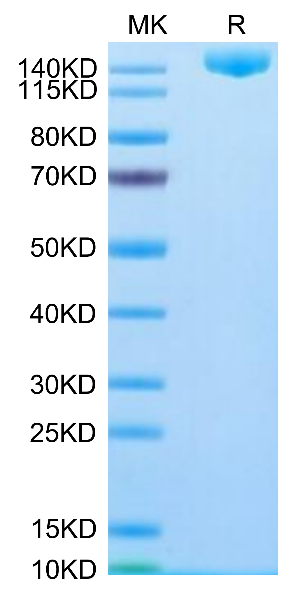 The protein has a predicted MW of 136.70 kDa. Due to glycosylation, the protein migrates to 140-180 kDa based on Bis-Tris PAGE result.