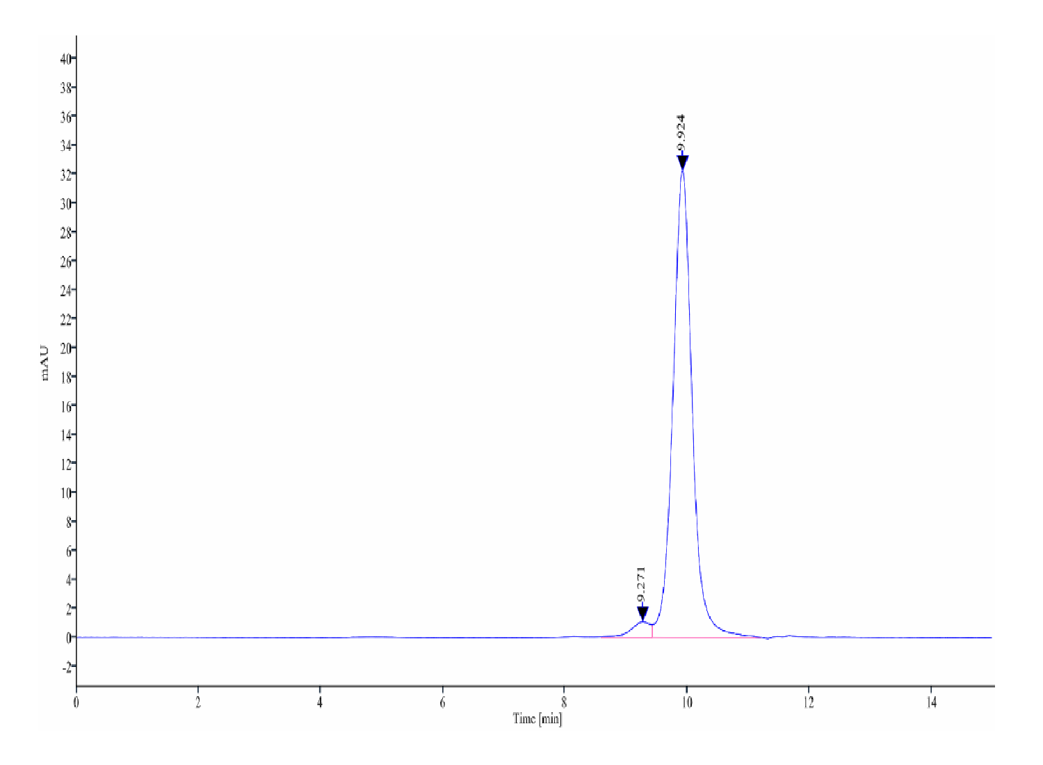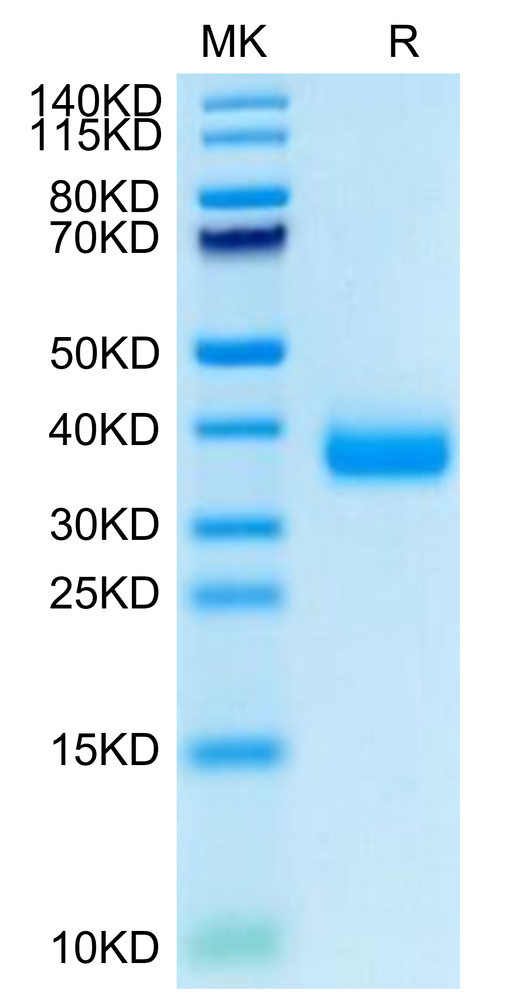 The protein has a predicted MW of 26.2 kDa. Due to glycosylation, the protein migrates to 35-40 kDa based on Bis-Tris PAGE result.