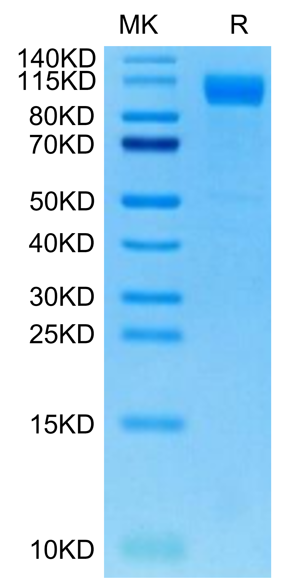The protein has a predicted MW of 73.94 kDa. Due to glycosylation, the protein migrates to 90-120 kDa based on Bis-Tris PAGE result.