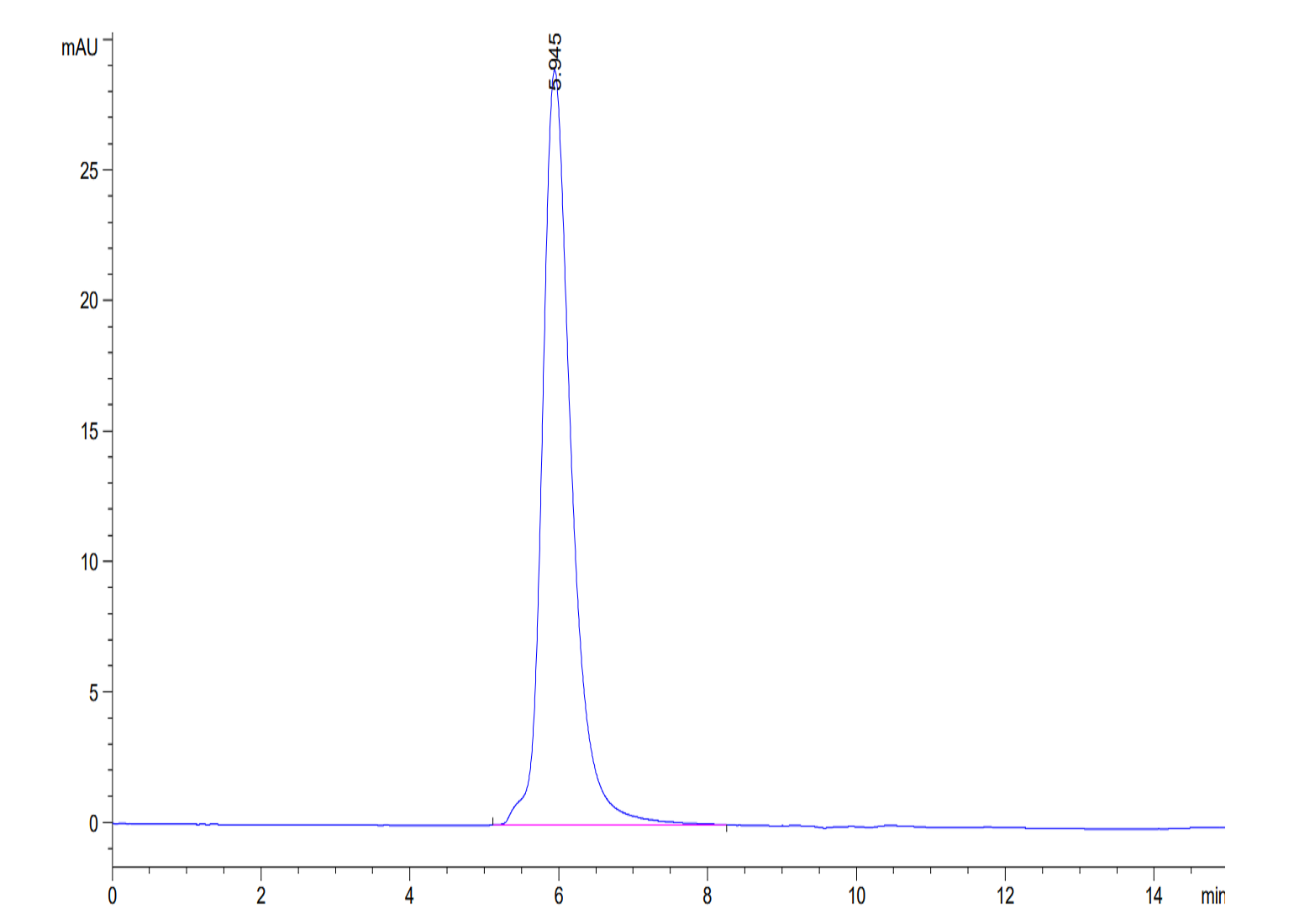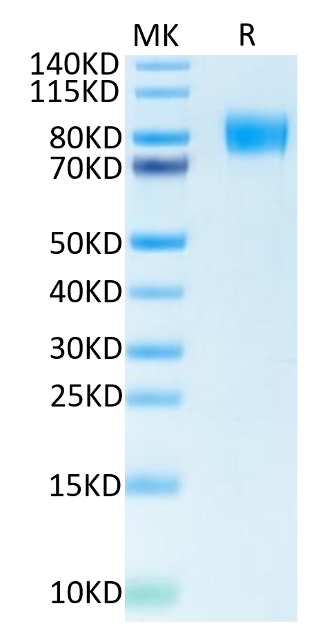 The protein has a predicted MW of 57.4 kDa. Due to glycosylation, the protein migrates to 75-105 kDa based on Bis-Tris PAGE result.