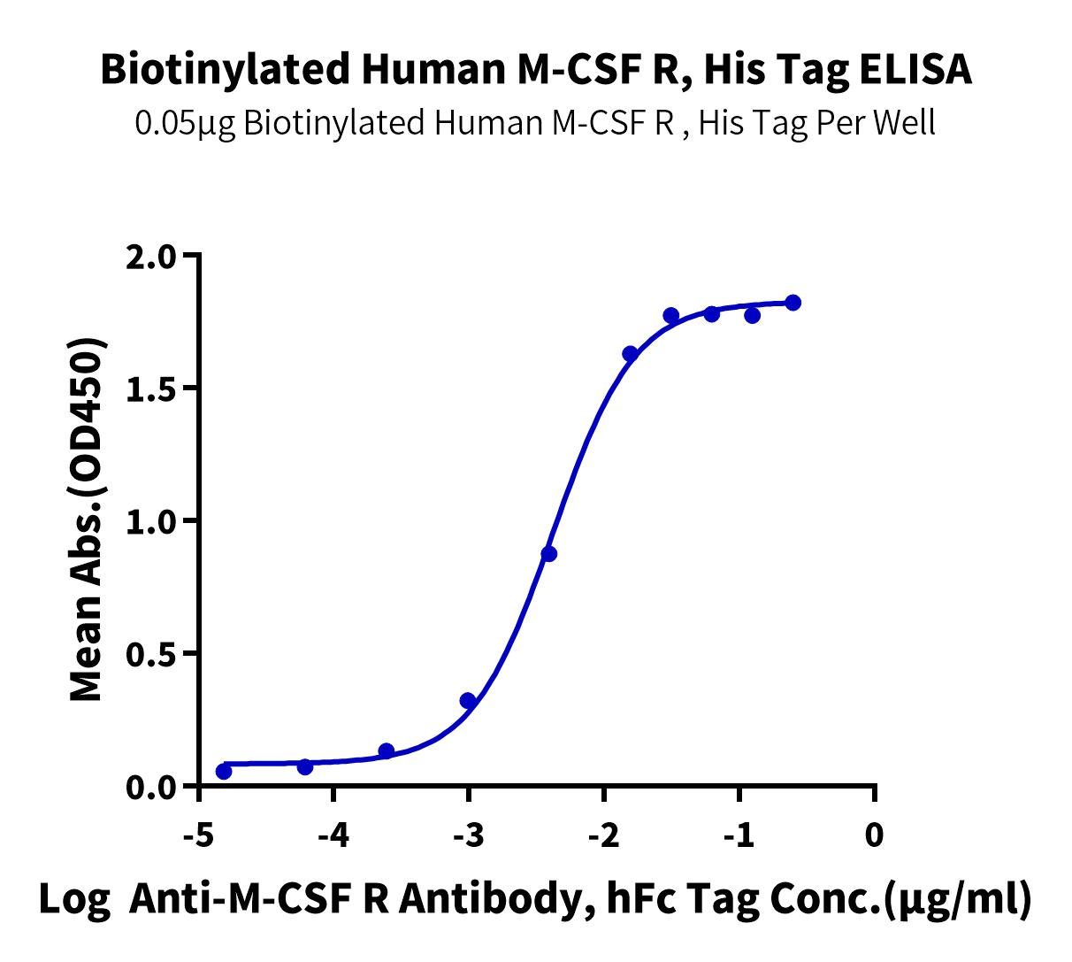 Recombinant Biotinylated Human M-CSF R/CSF1R/CD115 Protein is expressed from HEK293 with His tag and Avi tag at the C-Terminus.It contains Ile20-Glu512 [Accession | P07333-1].