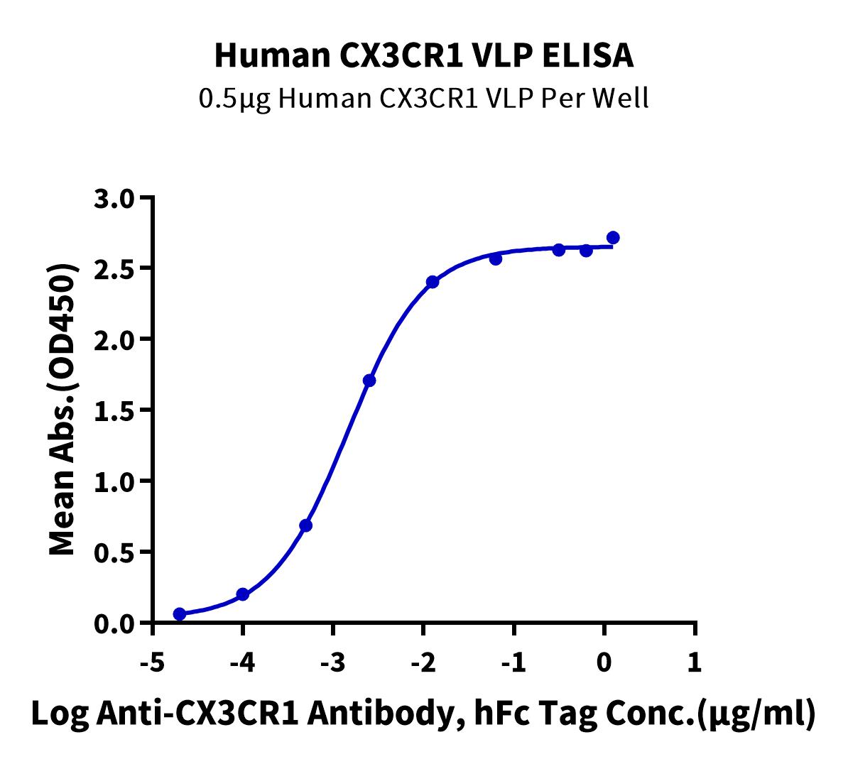 Recombinant Human CX3CR1 VLP is expressed from HEK293.It contains Met1-Leu355 (It may have cross reaction with anti-His antibody) [Accession | P49238-1].