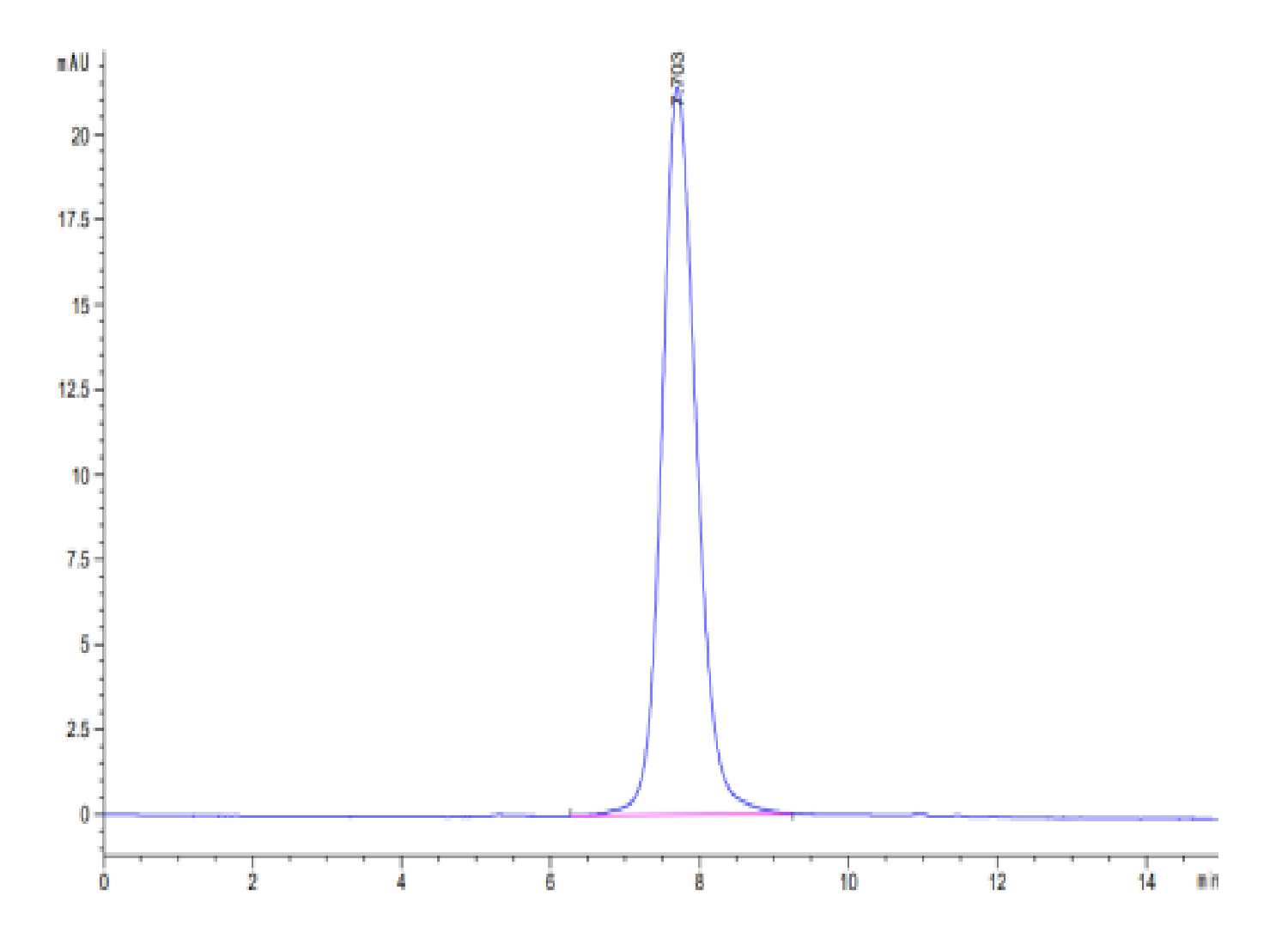 The protein has a predicted MW of 75.92 kDa. Due to glycosylation, the protein migrates to 90-120 kDa based on Bis-Tris PAGE result.
