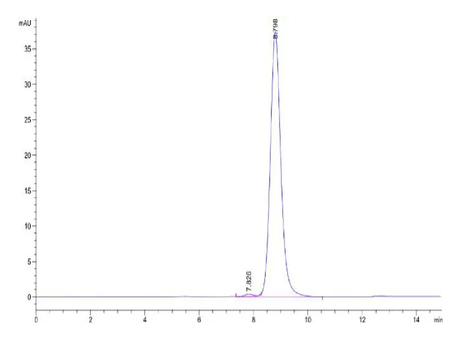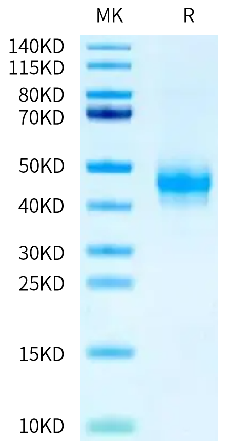 The protein has a predicted MW of 35.29 kDa. Due to glycosylation, the protein migrates to 40-50 kDa based on Bis-Tris PAGE result.