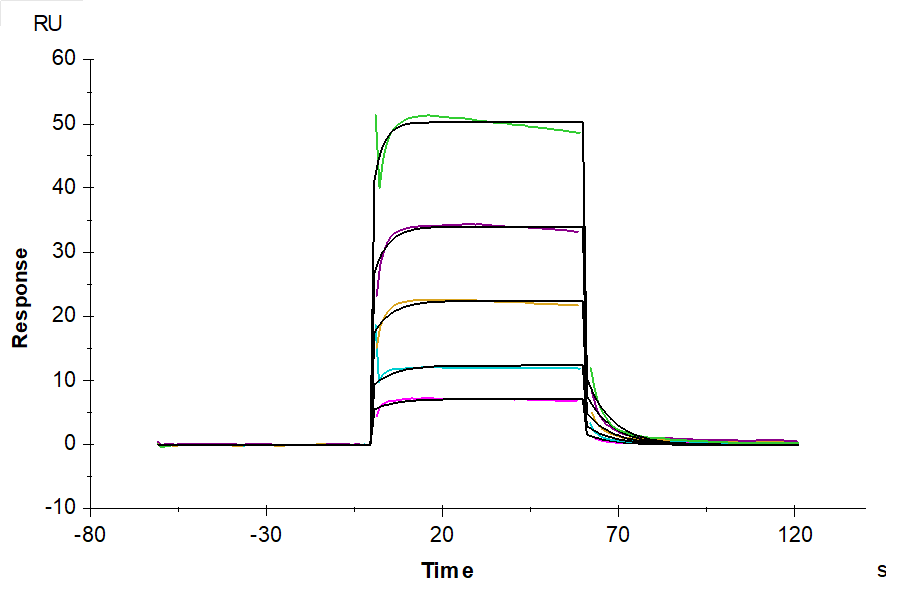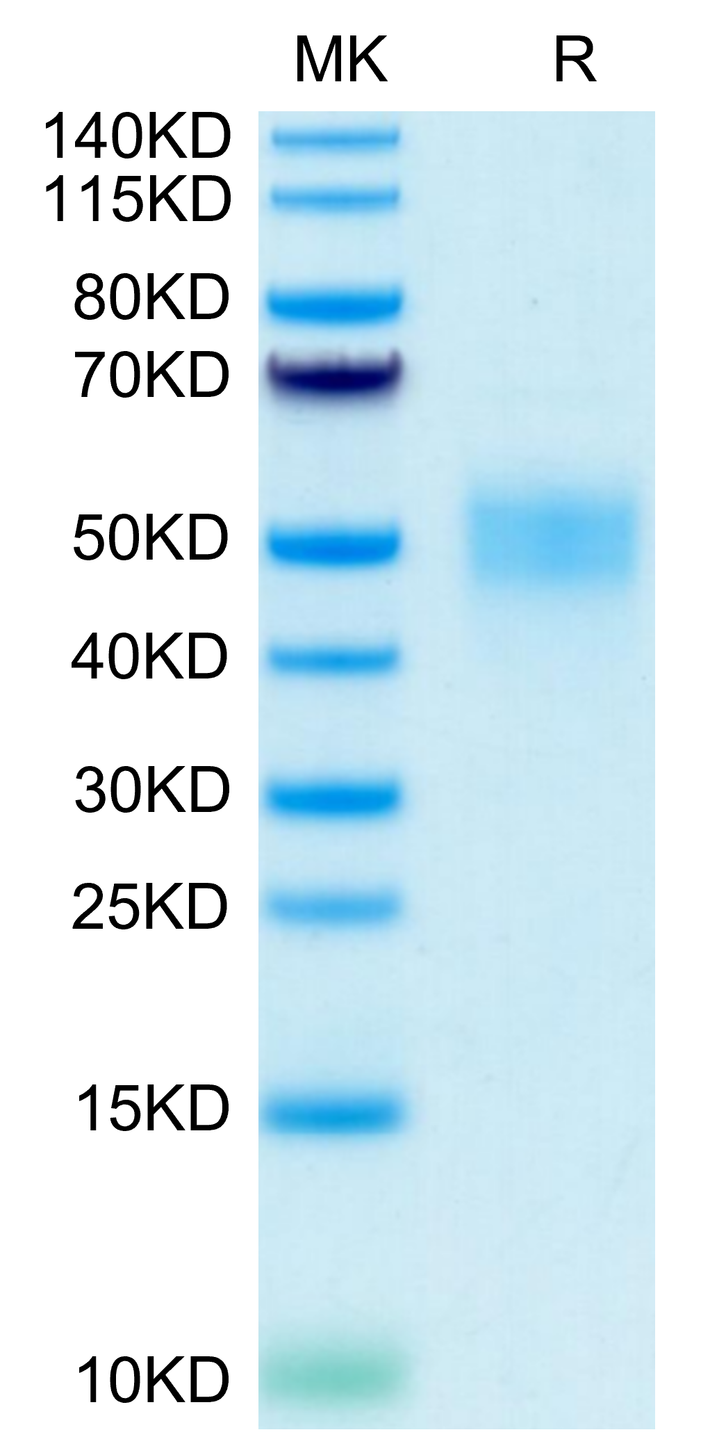The protein has a predicted MW of 23.7 kDa. Due to glycosylation, the protein migrates to 47-53 kDa based on Bis-Tris PAGE result. |
