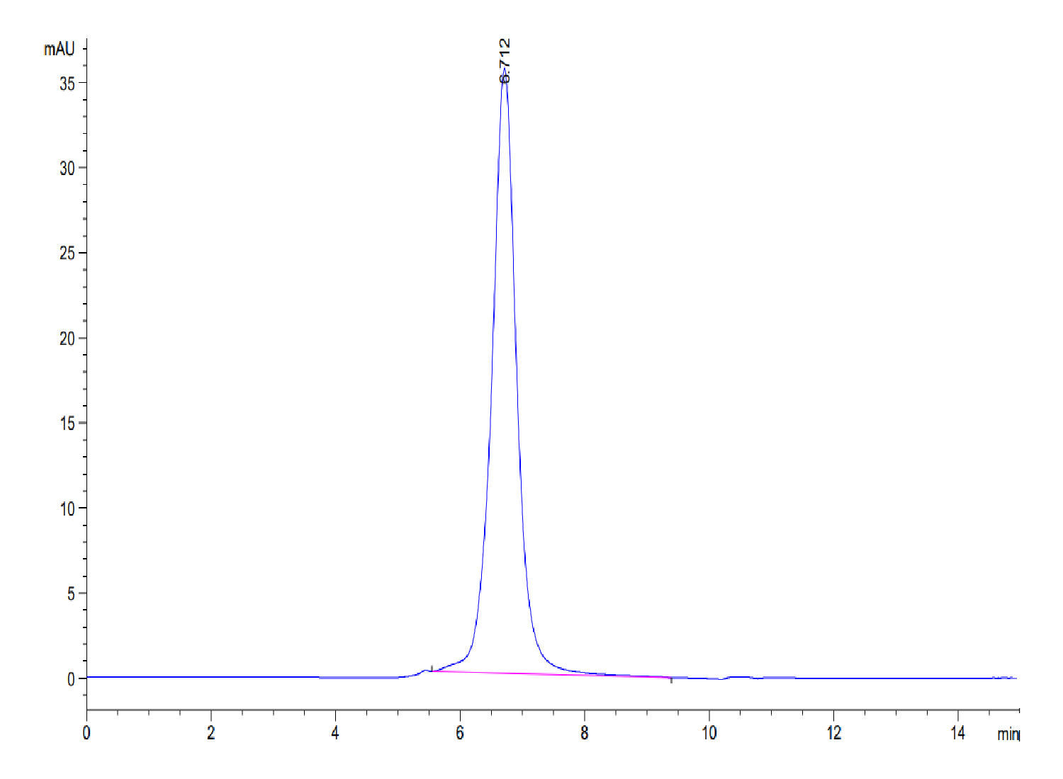 The protein has a predicted MW of 23.7 kDa. Due to glycosylation, the protein migrates to 47-53 kDa based on Bis-Tris PAGE result.