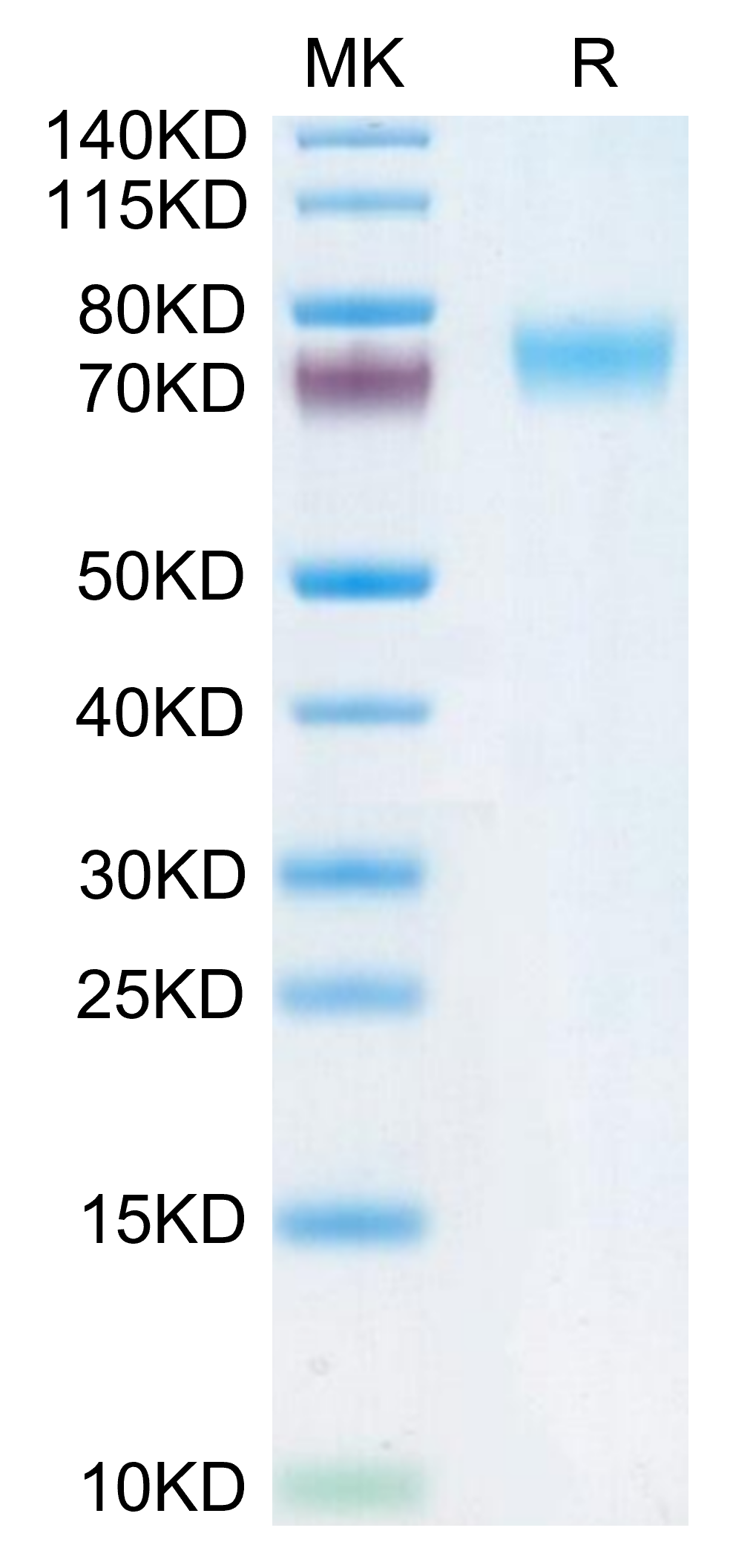 The protein has a predicted MW of 47.8 kDa. Due to glycosylation, the protein migrates to 70-78 kDa based on Bis-Tris PAGE result.
