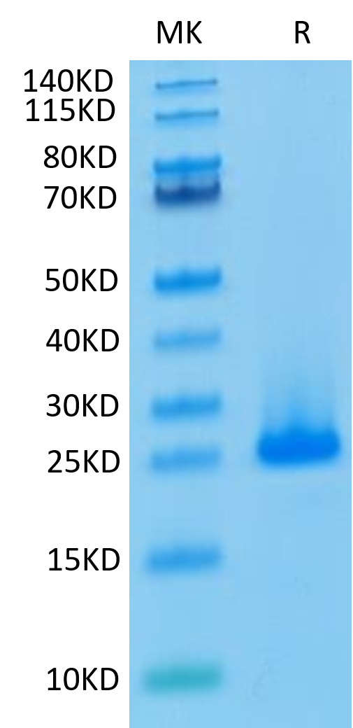 The protein has a predicted MW of 19.3 kDa. The protein migrates to 25 kDa based on Bis-Tris PAGE result. |