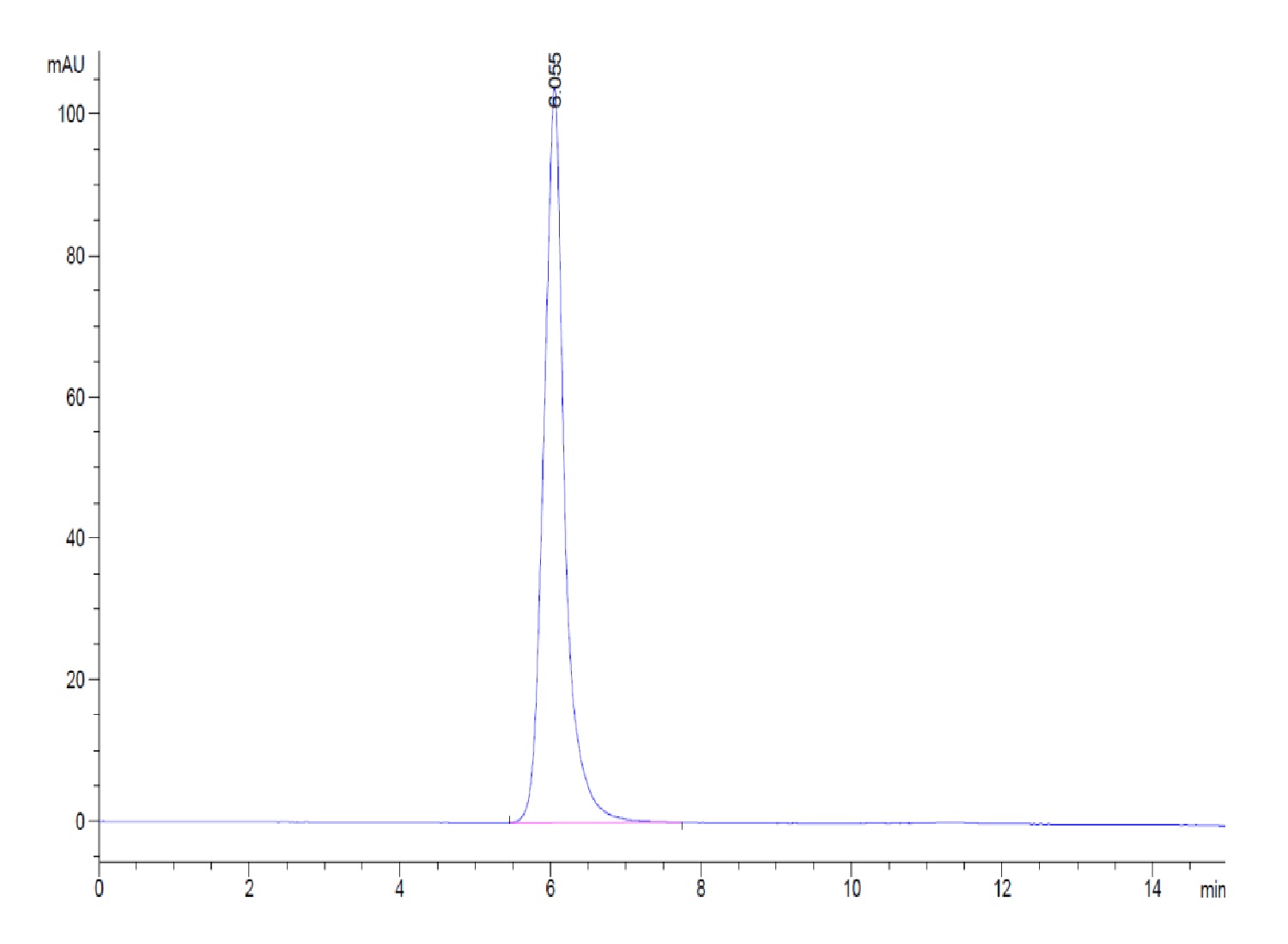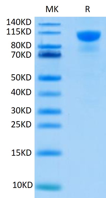 The protein has a predicted MW of 66.4 kDa. Due to glycosylation, the protein migrates to 80-115 kDa based on Bis-Tris PAGE result.
