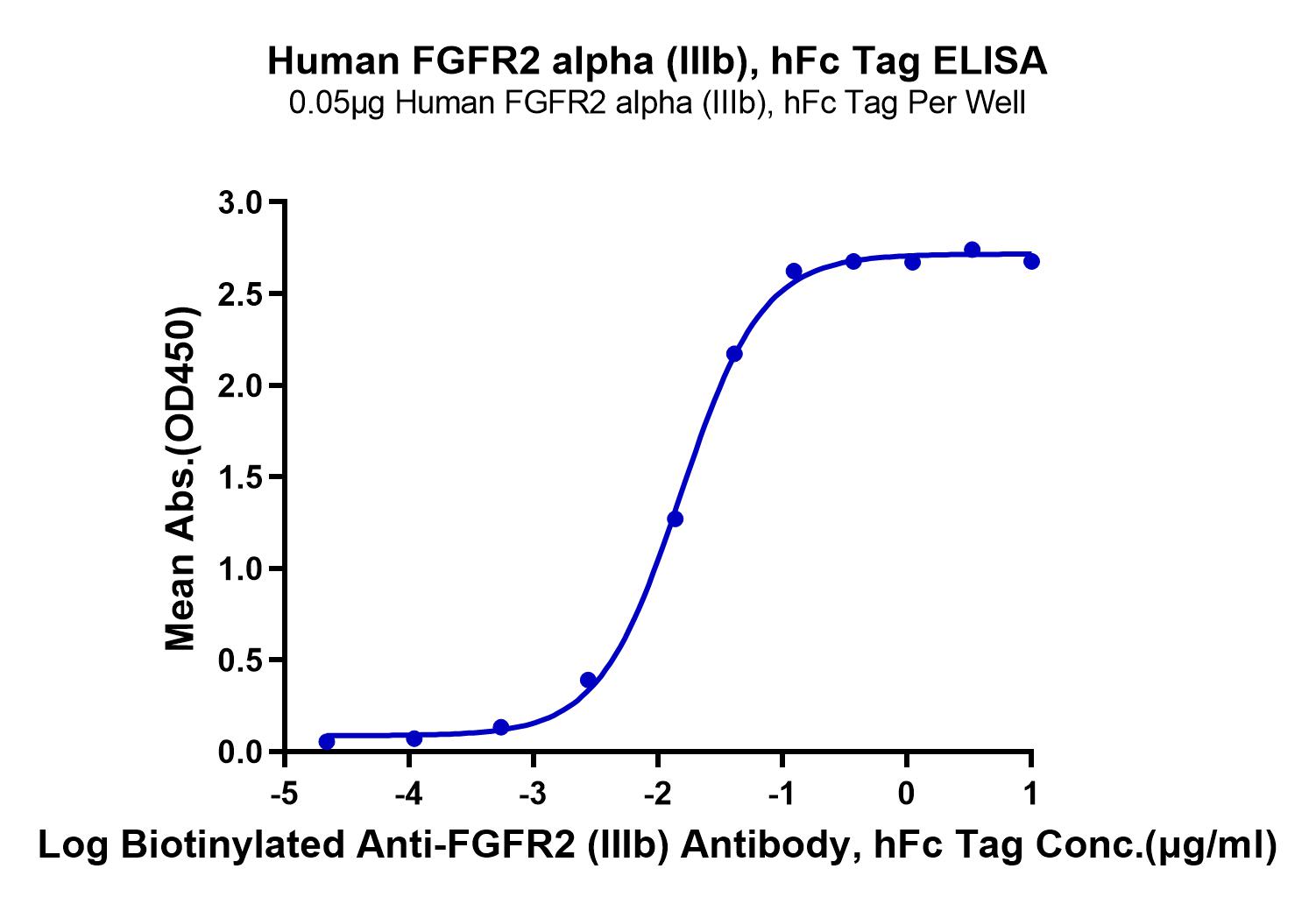 Recombinant Human FGFR2 alpha (IIIb) Protein is expressed from HEK293 with hFc (IgG1) tag at the C-Terminus.It contains Arg22-Glu378 [Accession | P21802-3].