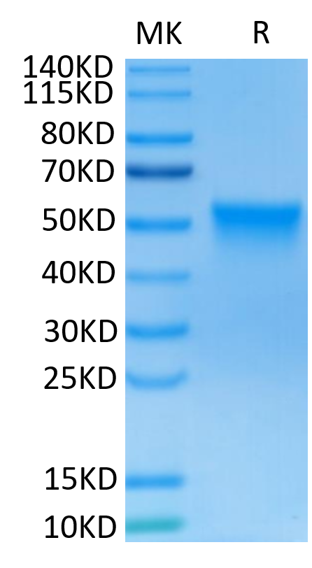 The protein has a predicted MW of 30.1 kDa. Due to glycosylation, the protein migrates to 50-60 kDa based on Bis-Tris PAGE result.