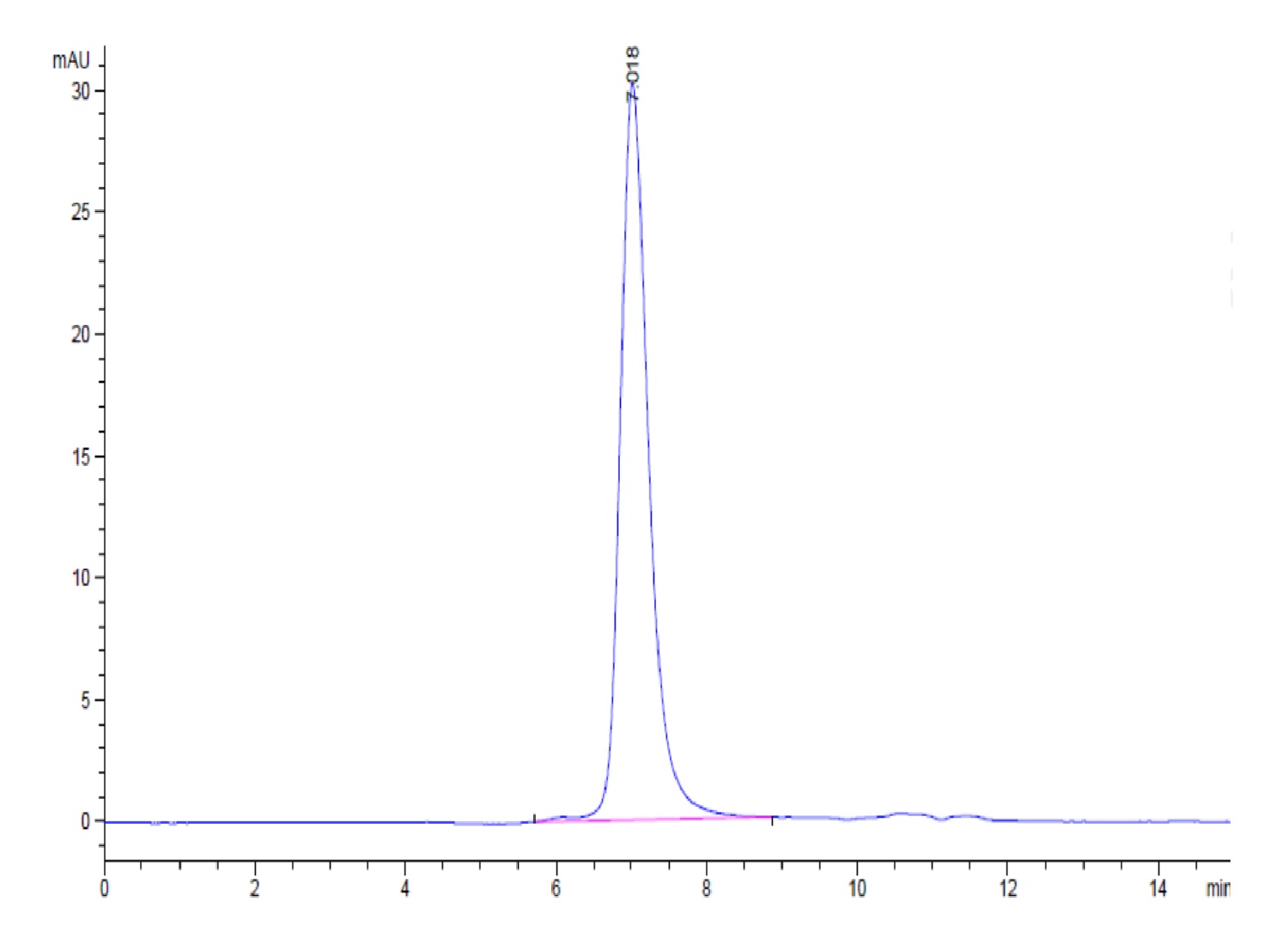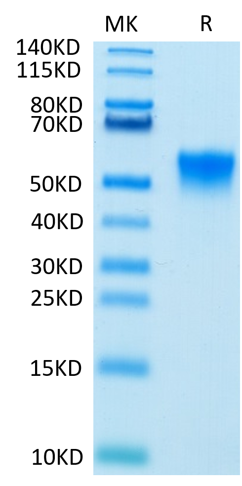 The protein has a predicted MW of 30.1 kDa. Due to glycosylation, the protein migrates to 50-60 kDa based on Bis-Tris PAGE result.