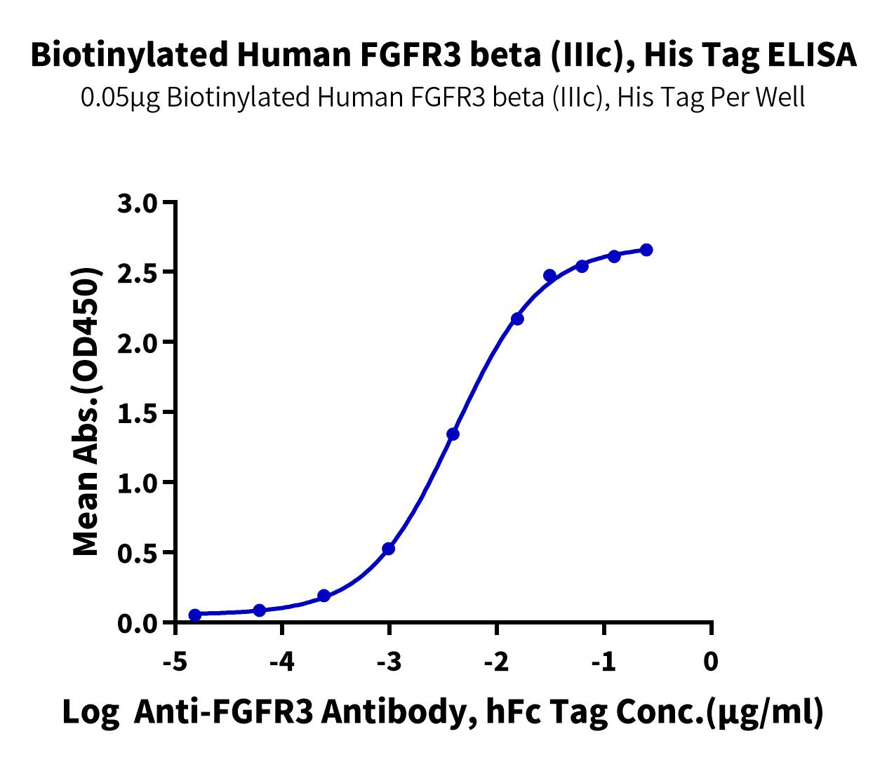 Recombinant Biotinylated Human FGFR3 beta (IIIc) Protein is expressed from HEK293 with His tag and Avi tag at the C-Terminus.It contains Asp127-Gly375 [Accession | P22607].