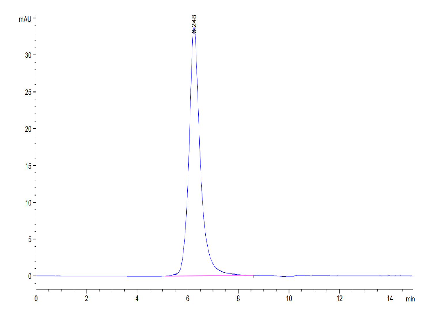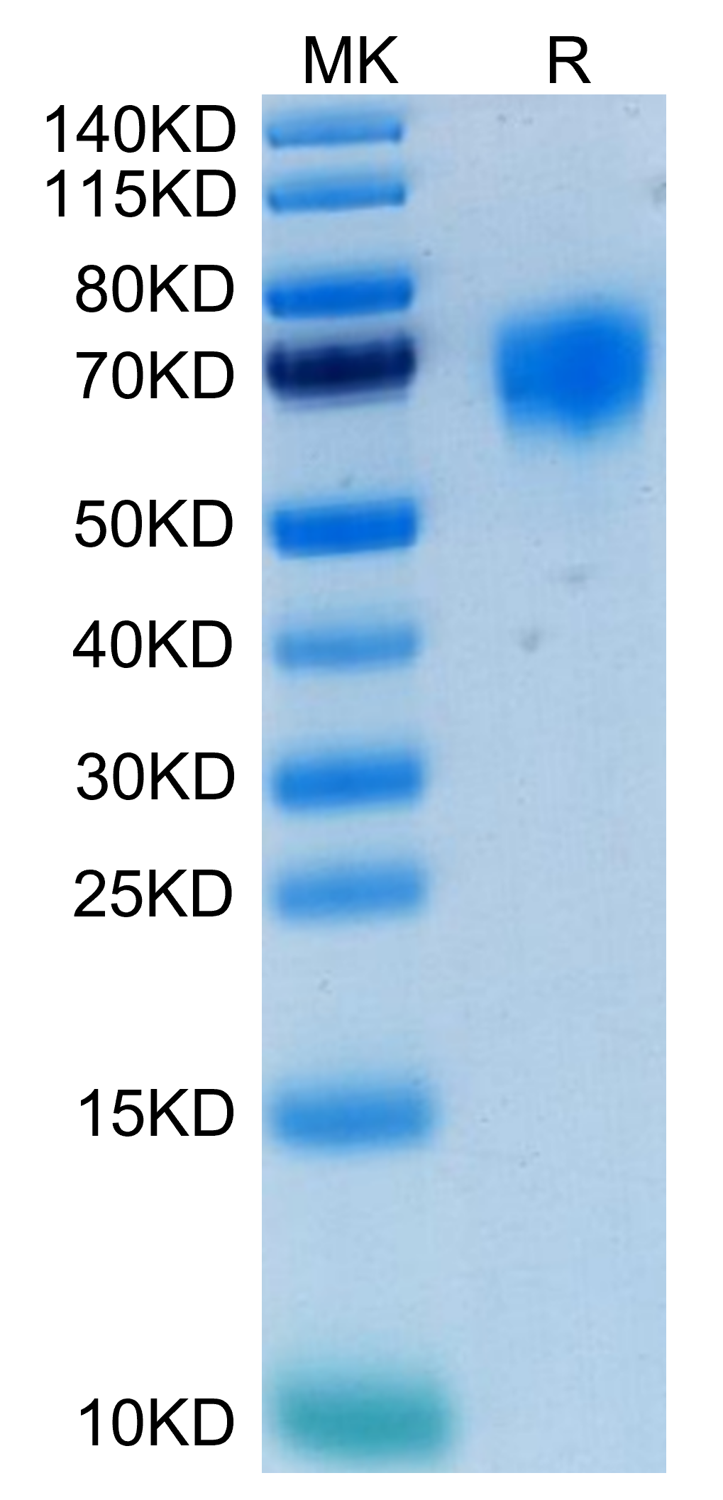 The protein has a predicted MW of 41.4 kDa. Due to glycosylation, the protein migrates to 60-75 kDa based on Bis-Tris PAGE result.